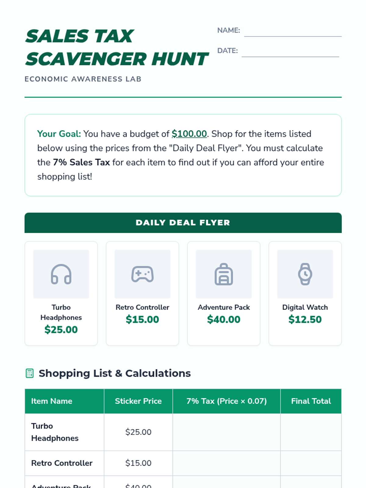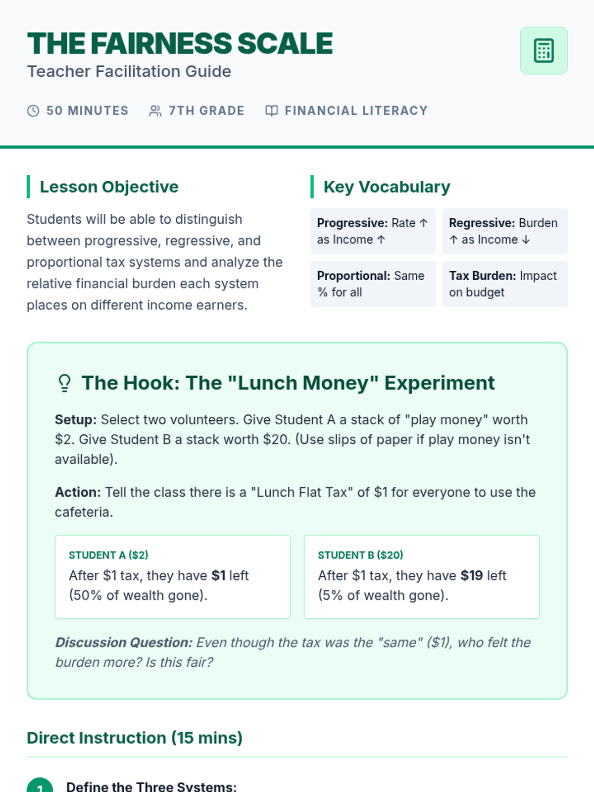 A comprehensive exploration of tax systems, marginal rates, and financial decision-making for 7th-grade students. This sequence moves from identifying types of taxes to mastering the math of tax brackets and evaluating the impact of tax policy on individuals and society.