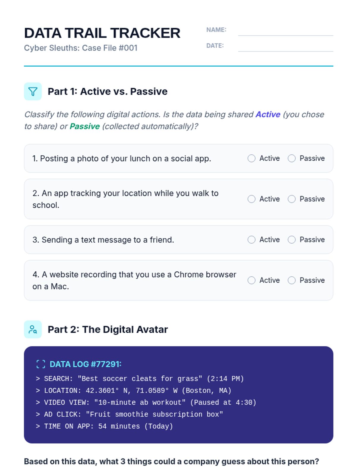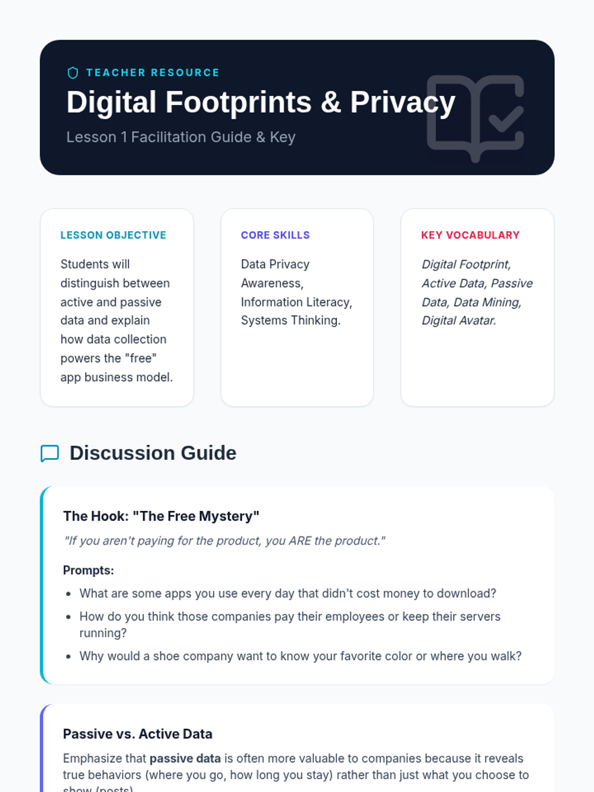 A comprehensive 5-lesson sequence for 5th graders focused on digital ethics, privacy, and critical evaluation of emerging technologies like algorithms and AI. Students move from understanding their data footprints to debating smart technology and creating an ethical tech pledge.