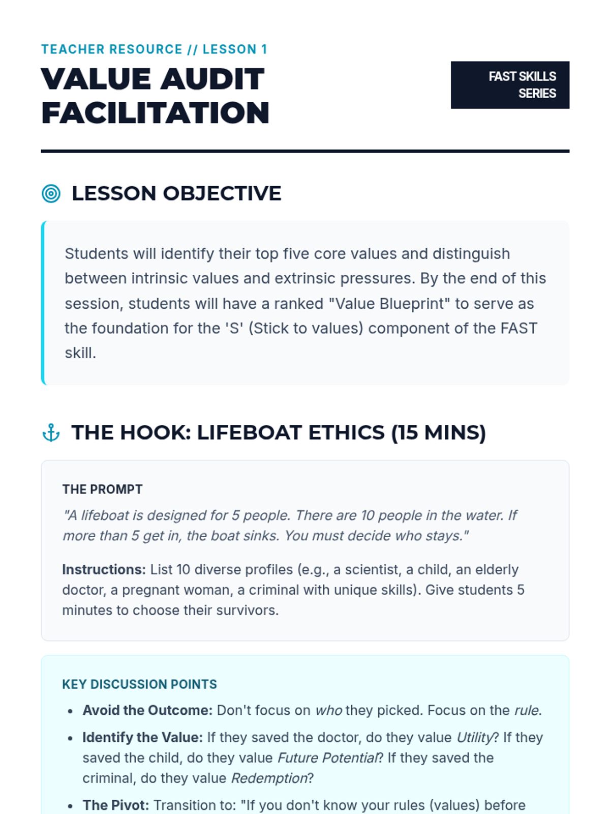 A 12th-grade sequence on FAST skills for self-respect, focusing on personal ethics, integrity in communication, and maintaining values in the face of external pressure and digital influence.
