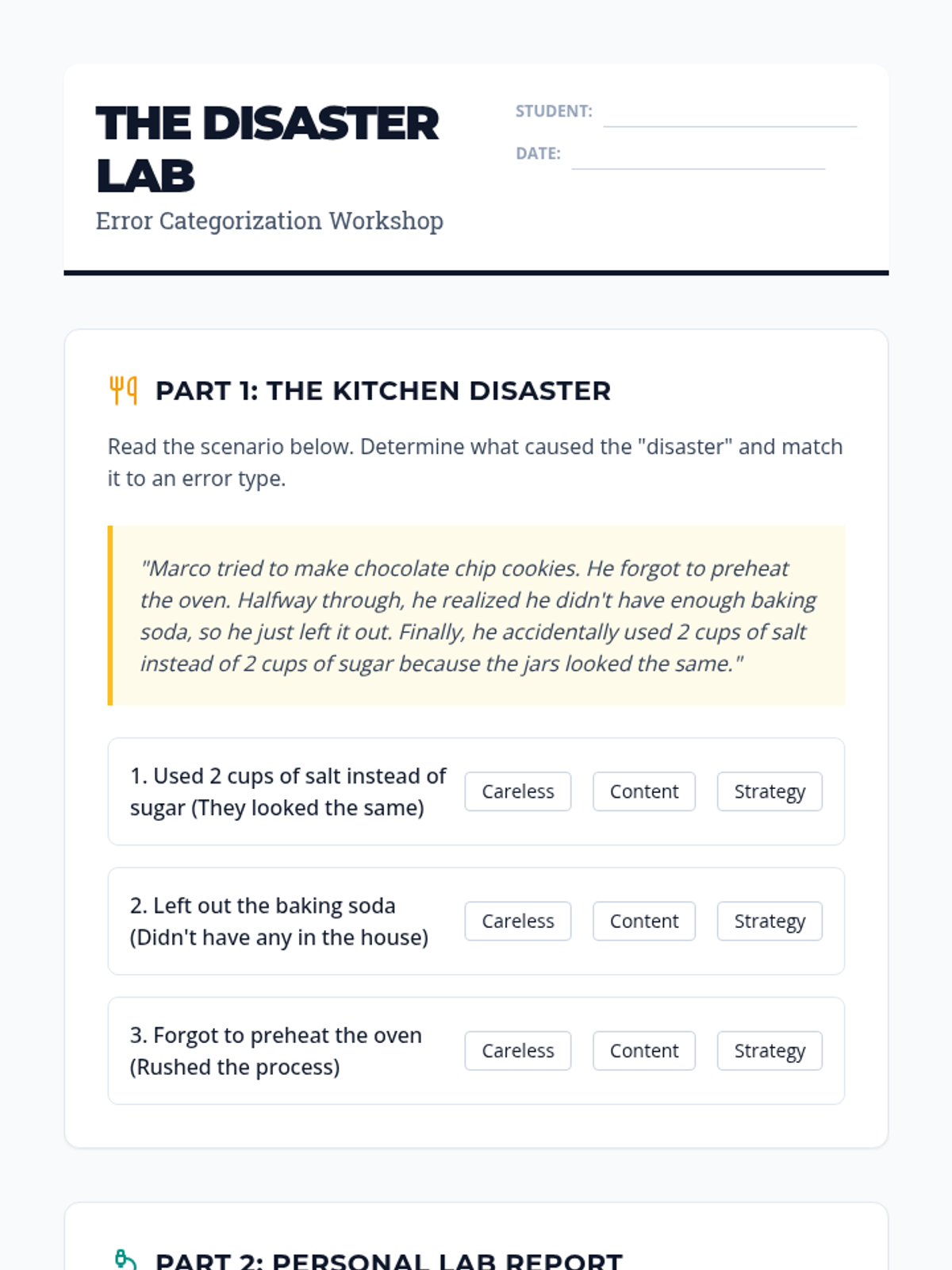 A comprehensive sequence on metacognitive error analysis, teaching students to categorize, analyze, and learn from their mistakes to improve test-taking performance. Students move from simple error classification to deep retrospective correction and personal strategy development.