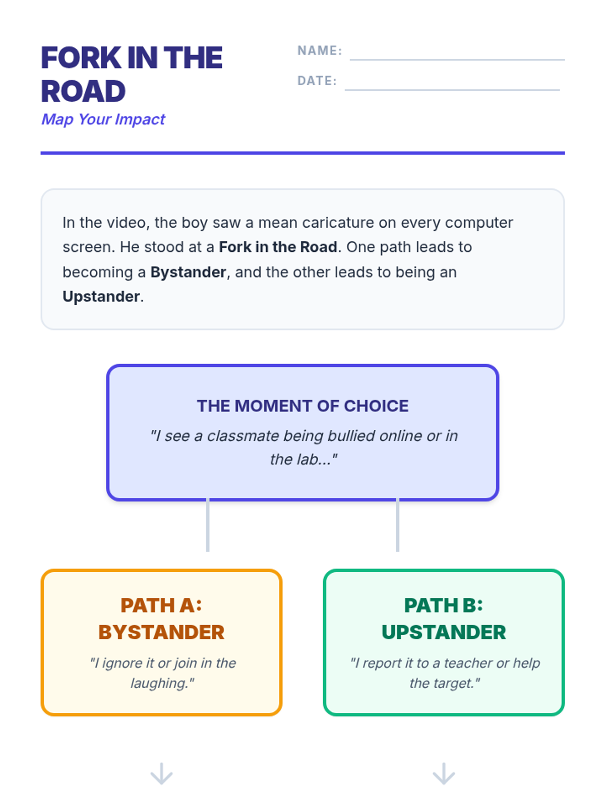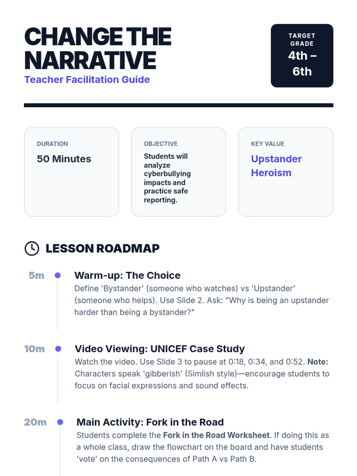 A comprehensive lesson sequence for 4th-6th graders on cyberbullying, focusing on the transition from a passive bystander to an active upstander through video analysis, role-play, and strategic reporting.