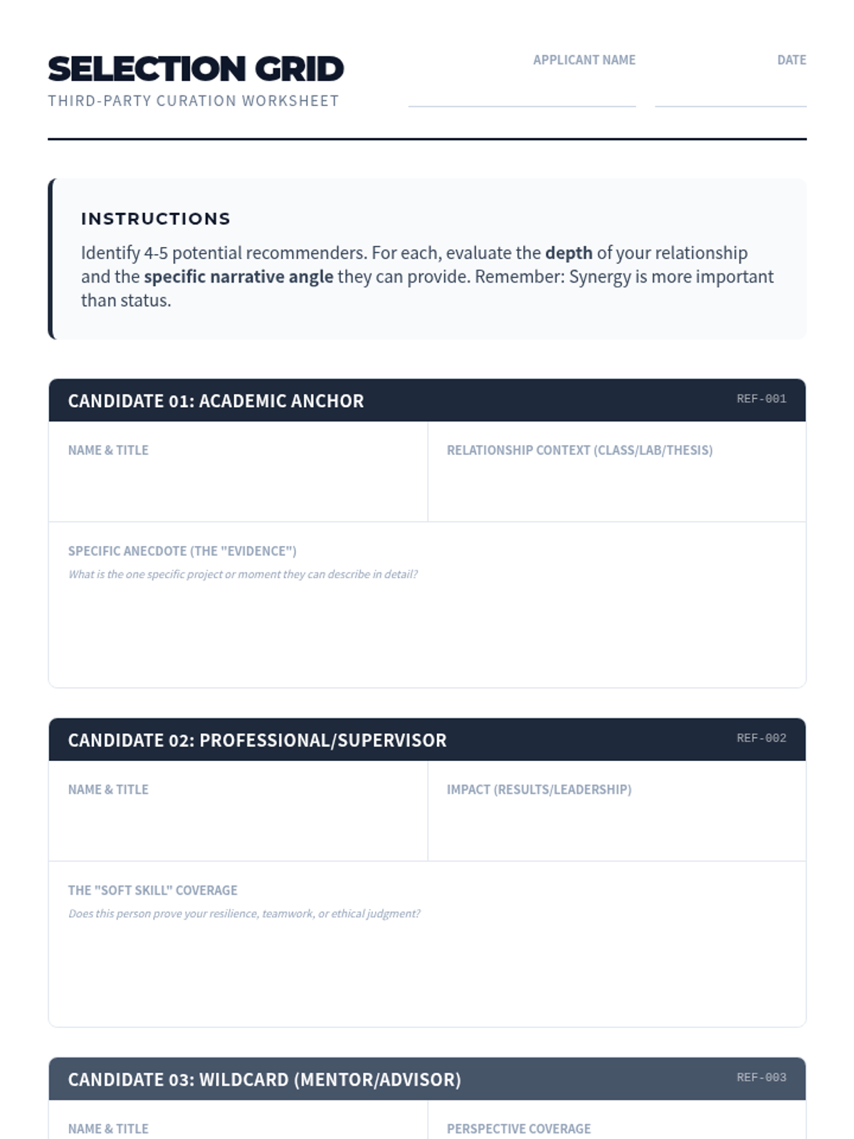 A comprehensive project-based sequence for graduate students focusing on the strategic curation and management of third-party application materials. Students learn to select recommenders, draft 'brag sheets', navigate ethical considerations like FERPA, and audit application packets for narrative consistency.