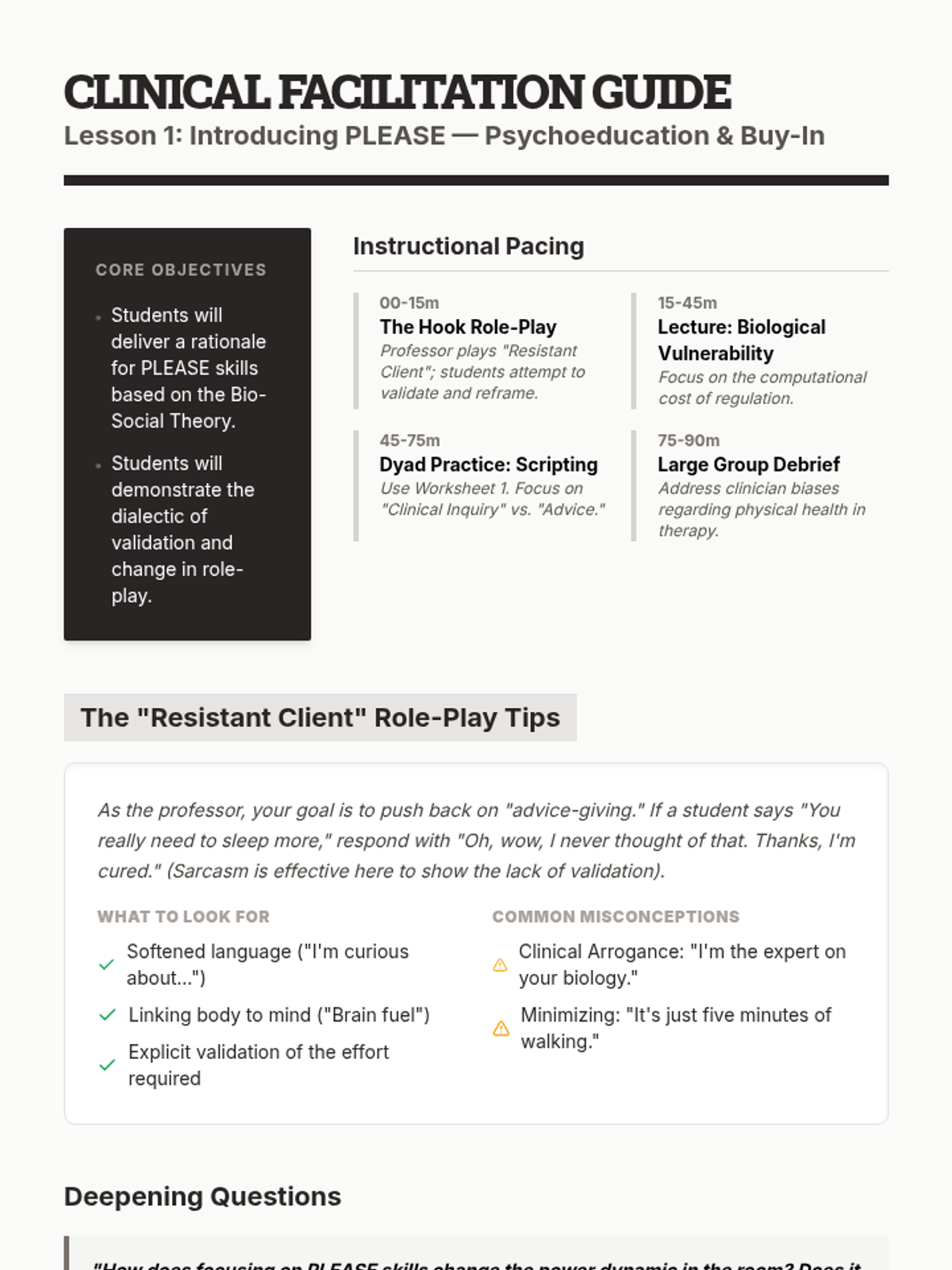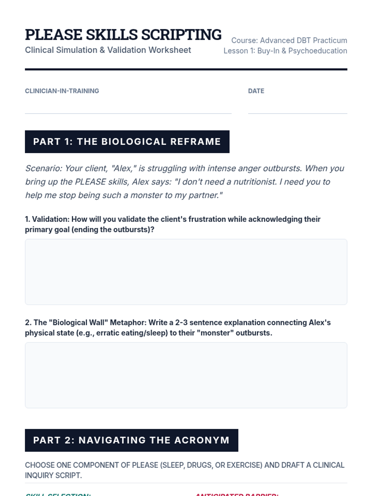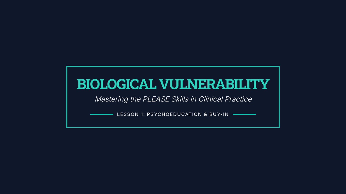 This graduate-level sequence focuses on the clinical application of PLEASE skills within DBT. Students will master the assessment, psychoeducation, and troubleshooting of physiological vulnerability factors, progressing from building client buy-in to designing complex, individualized protocols for diverse populations.