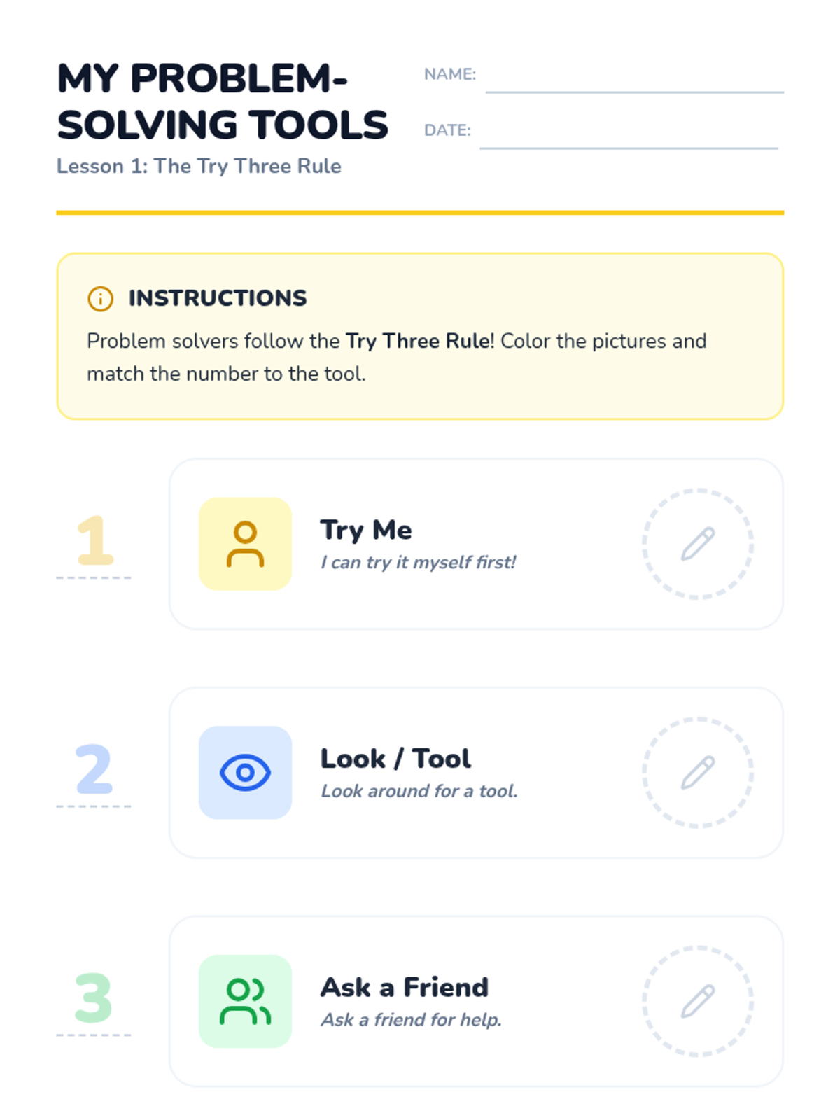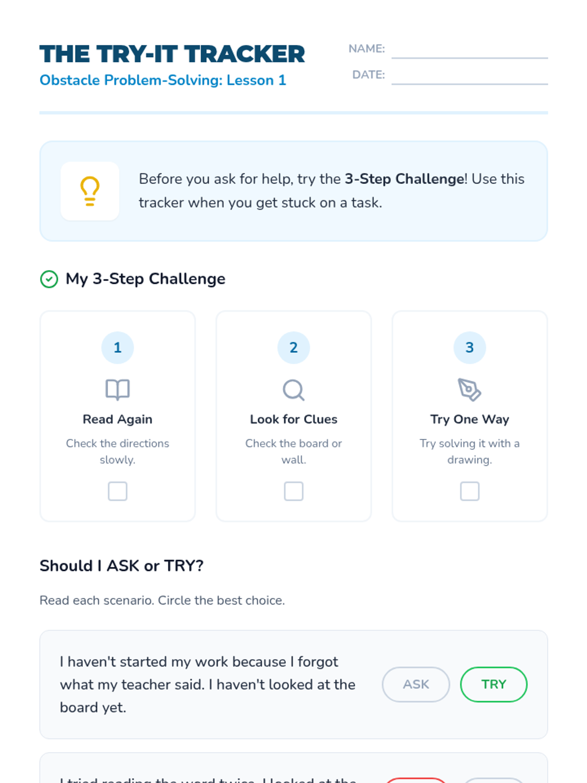 A sequence for Kindergarten students focusing on self-advocacy and problem-solving. Students learn a graduated prompting hierarchy (Try Three Rule), identify appropriate helpers, use specific scripts to ask for help, and distinguish between being helped and being taught.