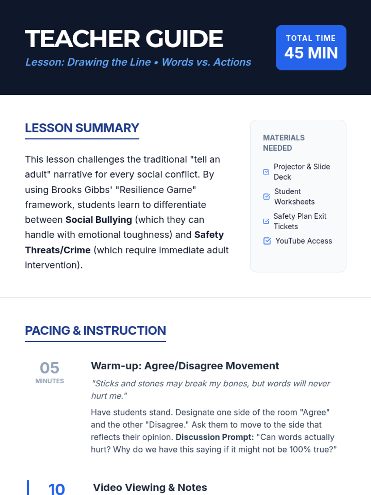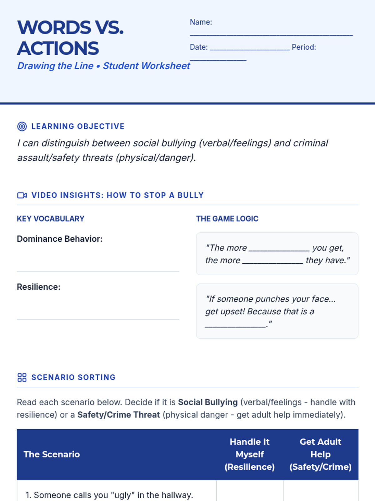 A middle school lesson sequence focused on the distinction between verbal bullying and physical/criminal safety threats, emphasizing resilience for the former and adult intervention for the latter.