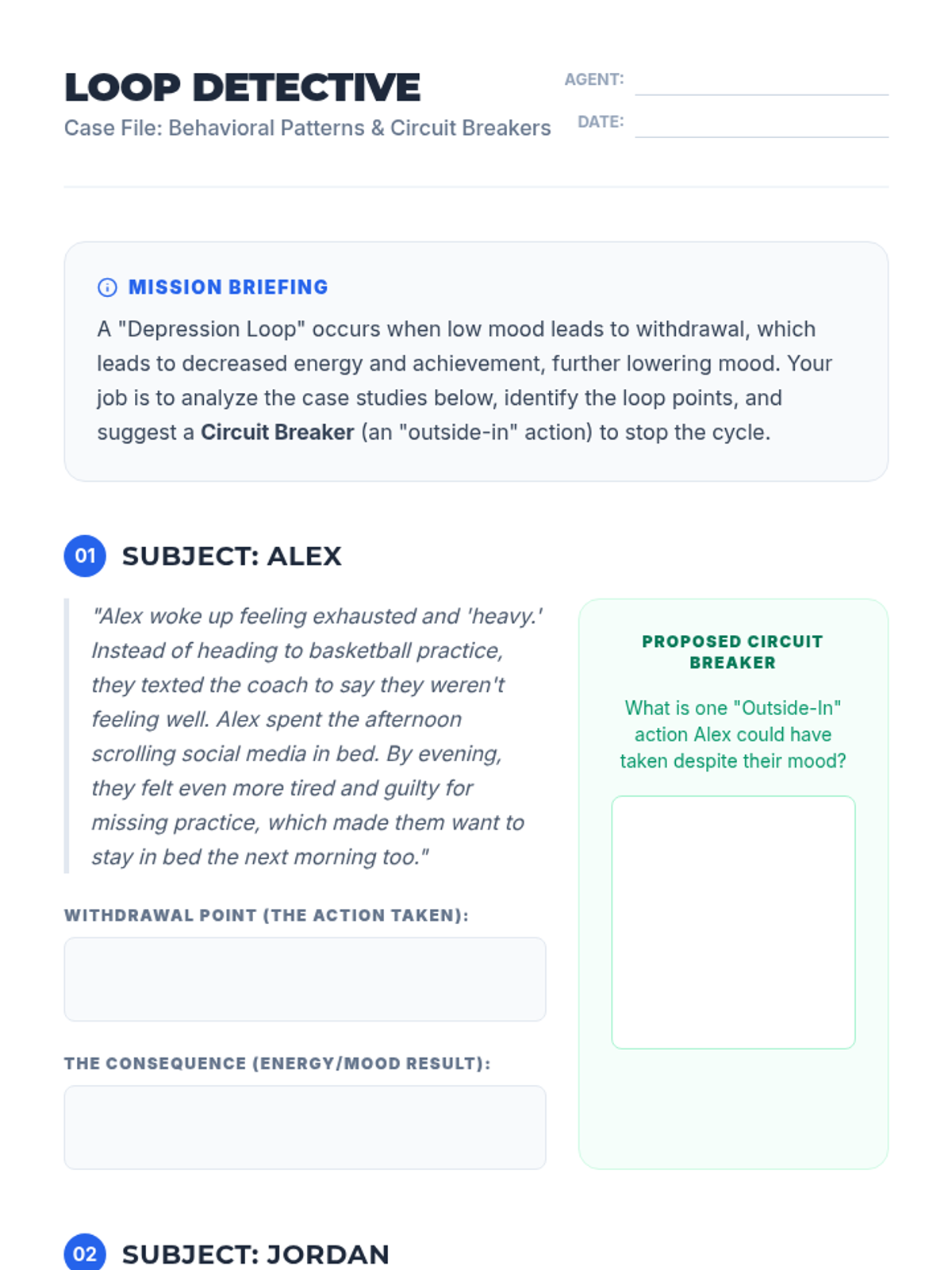 This sequence guides 11th-grade students through Behavioral Activation, teaching them to audit their routines, categorize activities by mastery and pleasure, and design a personalized schedule to proactively manage their mood and mental well-being.