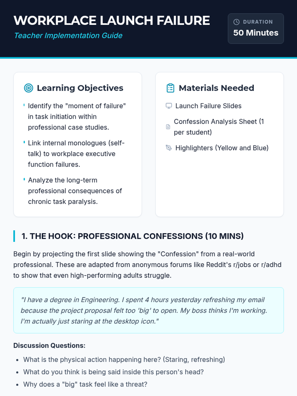 A comprehensive sequence for transition-age students to master self-talk strategies for task initiation in professional and independent living contexts. Students move from analyzing workplace failures to building a personalized 'Standard Operating Procedure' for overcoming task paralysis.