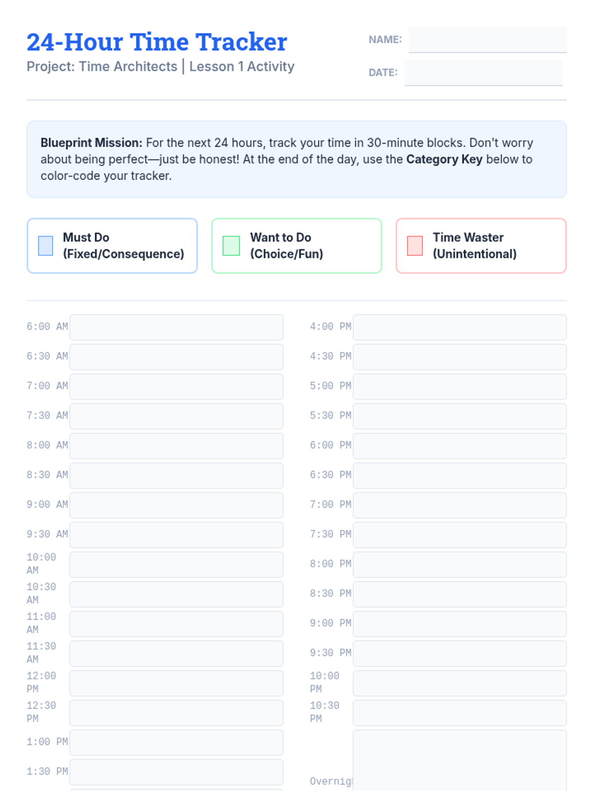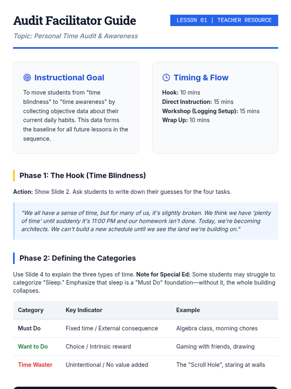 This sequence teaches 9th-grade students the foundational skills of time management and prioritization. Students will transition from tracking their current habits to designing a proactive, balanced schedule that aligns with their personal and academic goals.