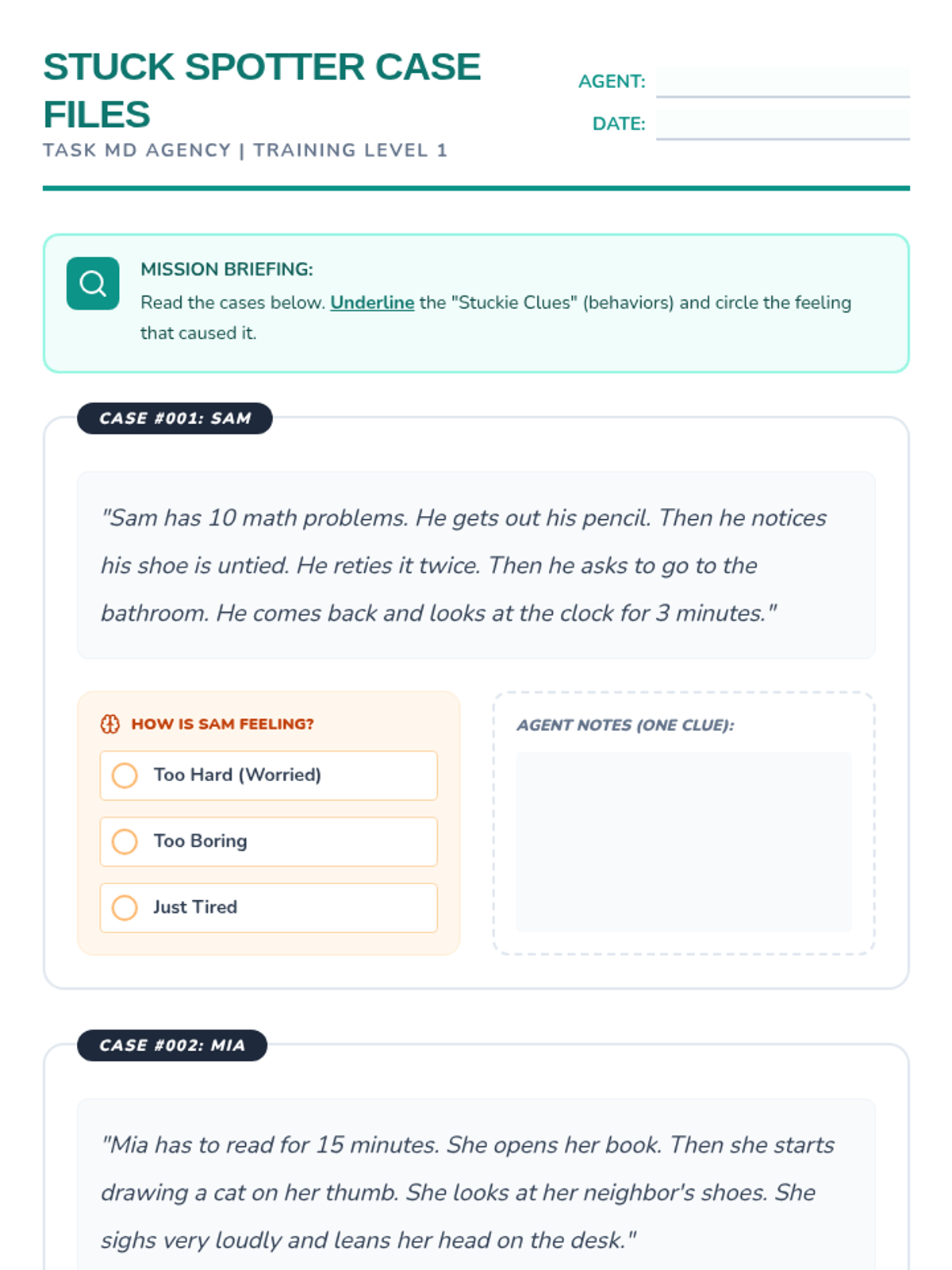 A 5-lesson unit for 3rd-grade students focused on identifying and categorizing obstacles that prevent task completion. Students learn to recognize internal emotional signals and external barriers (physical, informational, and environmental) to build self-advocacy and problem-solving skills.