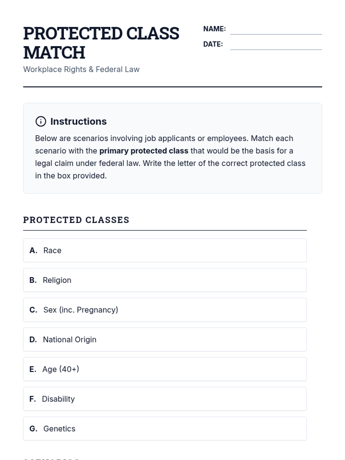 This sequence provides 10th-grade students with a comprehensive understanding of federal anti-discrimination laws in the workplace, covering protected classes, major legislative acts, legal theories of discrimination, and practical compliance application.