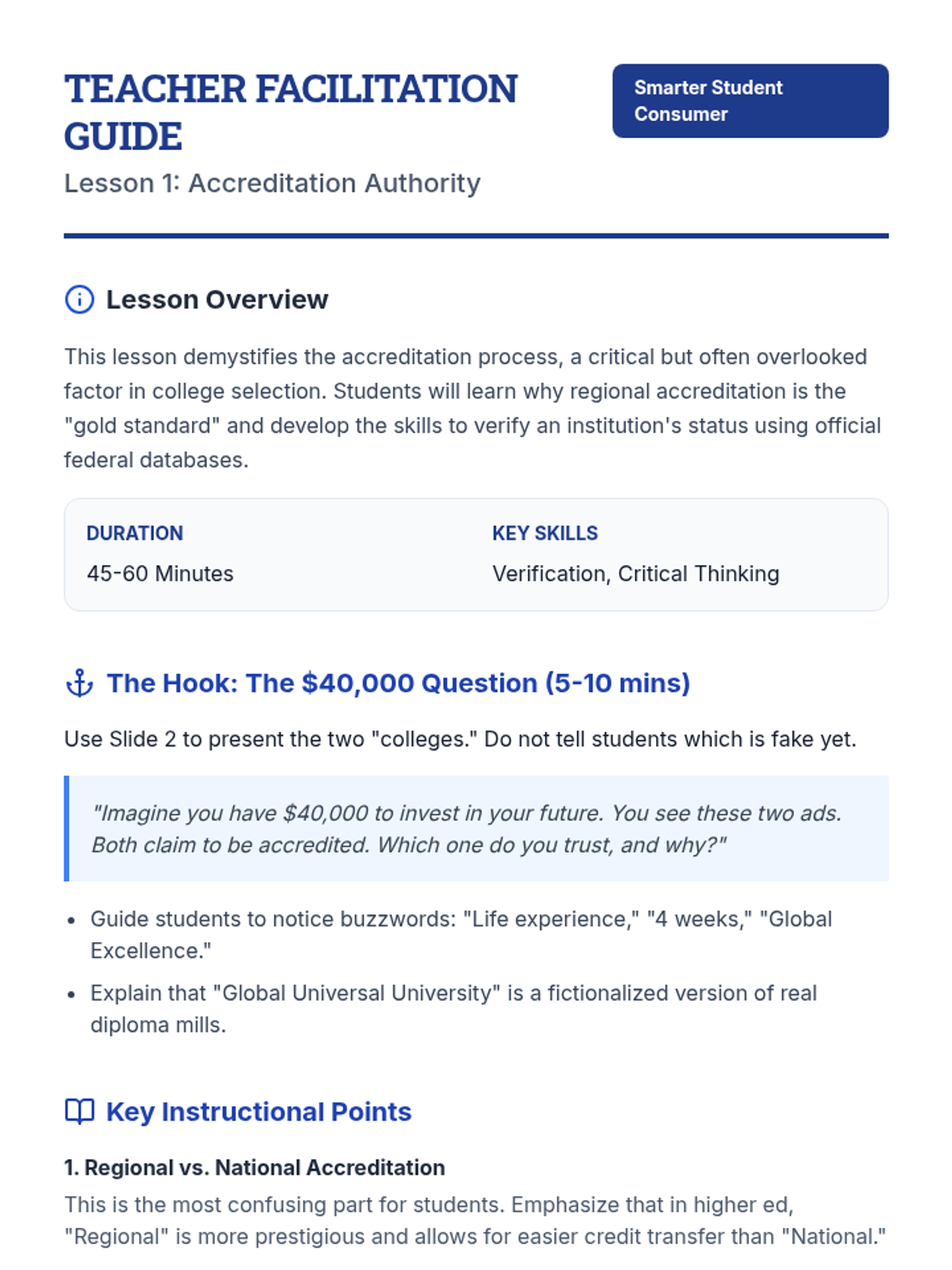 This sequence empowers 12th-grade students to evaluate post-secondary program quality. Students explore accreditation systems, analyze outcome data, compare non-profit vs. for-profit models, and identify predatory marketing to make informed educational investments.