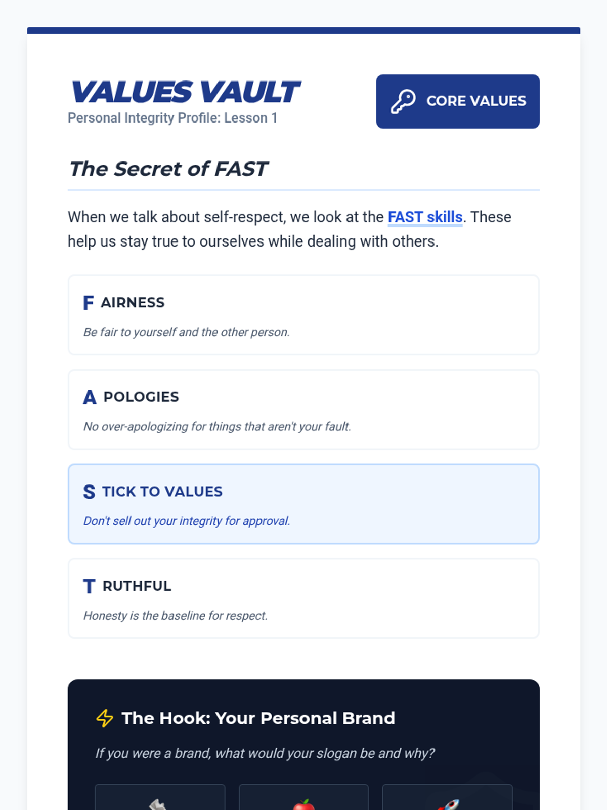 A project-based sequence for 6th graders to develop self-respect using FAST skills. Students explore personal values, digital authenticity, boundaries, and assertive communication to create a comprehensive 'Personal Code of Conduct' manifesto.