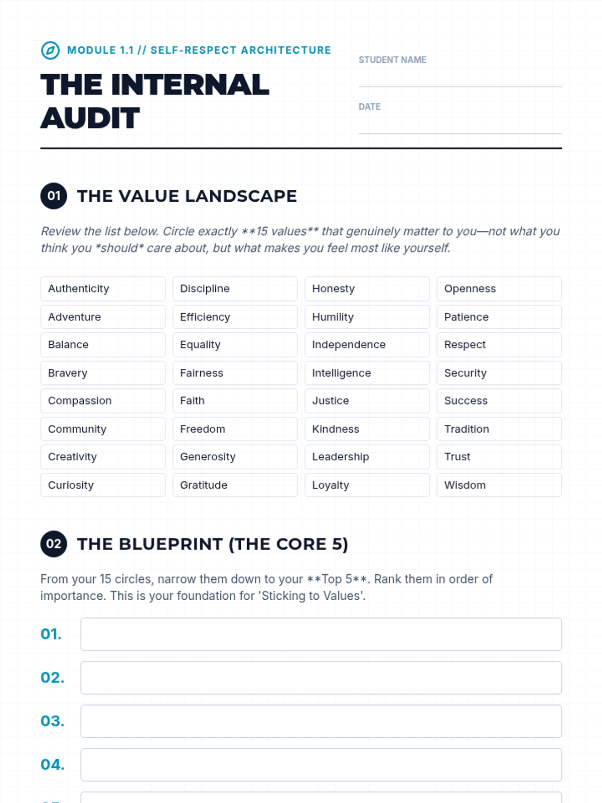 A career-readiness sequence designed for older students and undergraduates to identify their current skills, potential growth areas, and personality types using the Ikigai and Quadrant of Success models. Students move from auditing their time to creating a strategic roadmap for professional development.