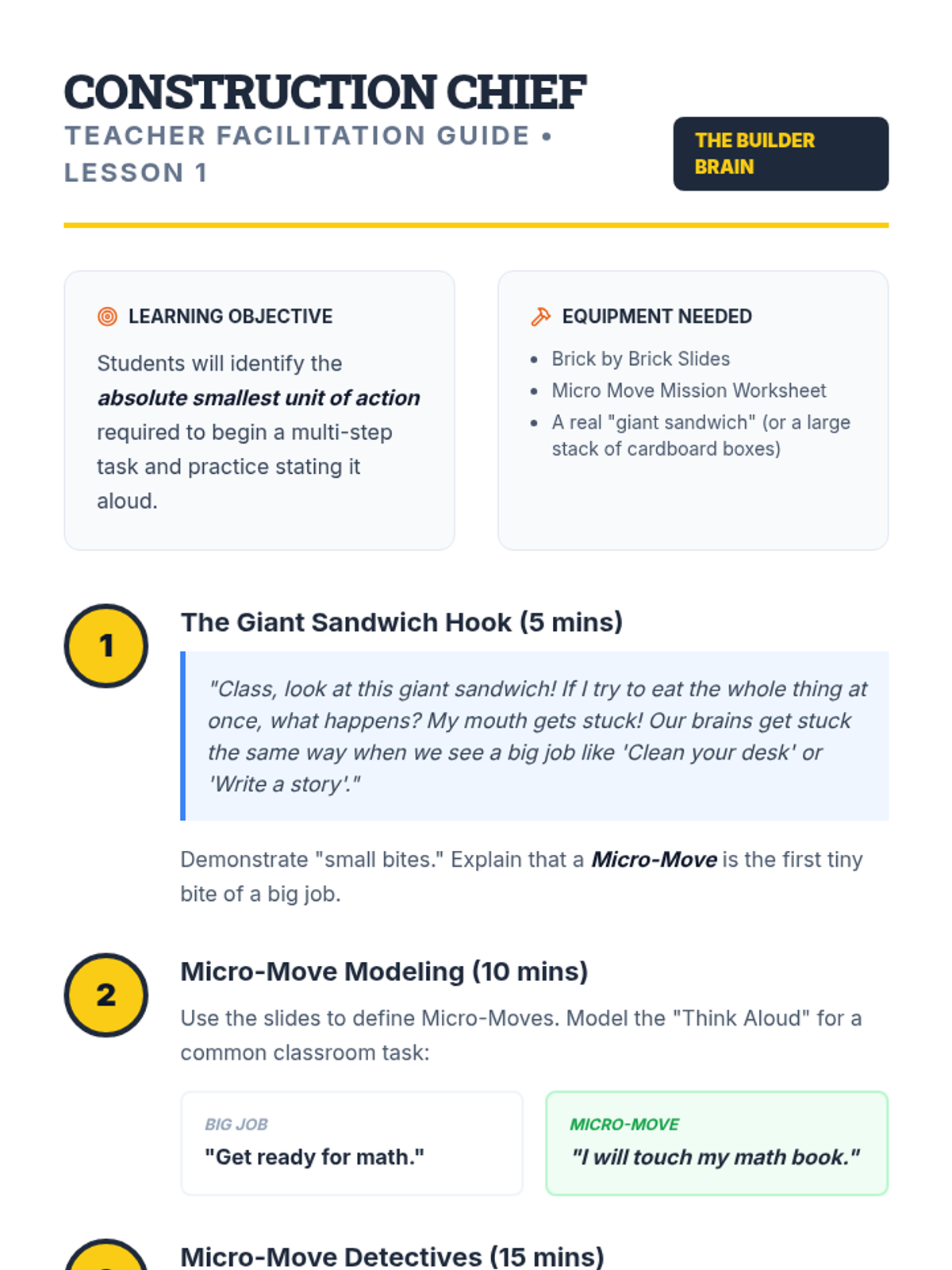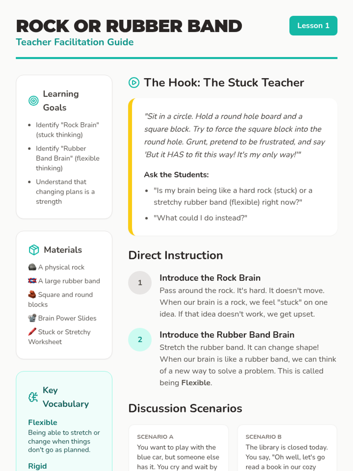A 5-lesson unit for 1st-grade students focusing on cognitive flexibility. Students learn to navigate obstacles, tool breakage, schedule changes, and unavailability using the 'Rock Brain' vs. 'Noodle Brain' metaphor and the 'Plan B' framework.