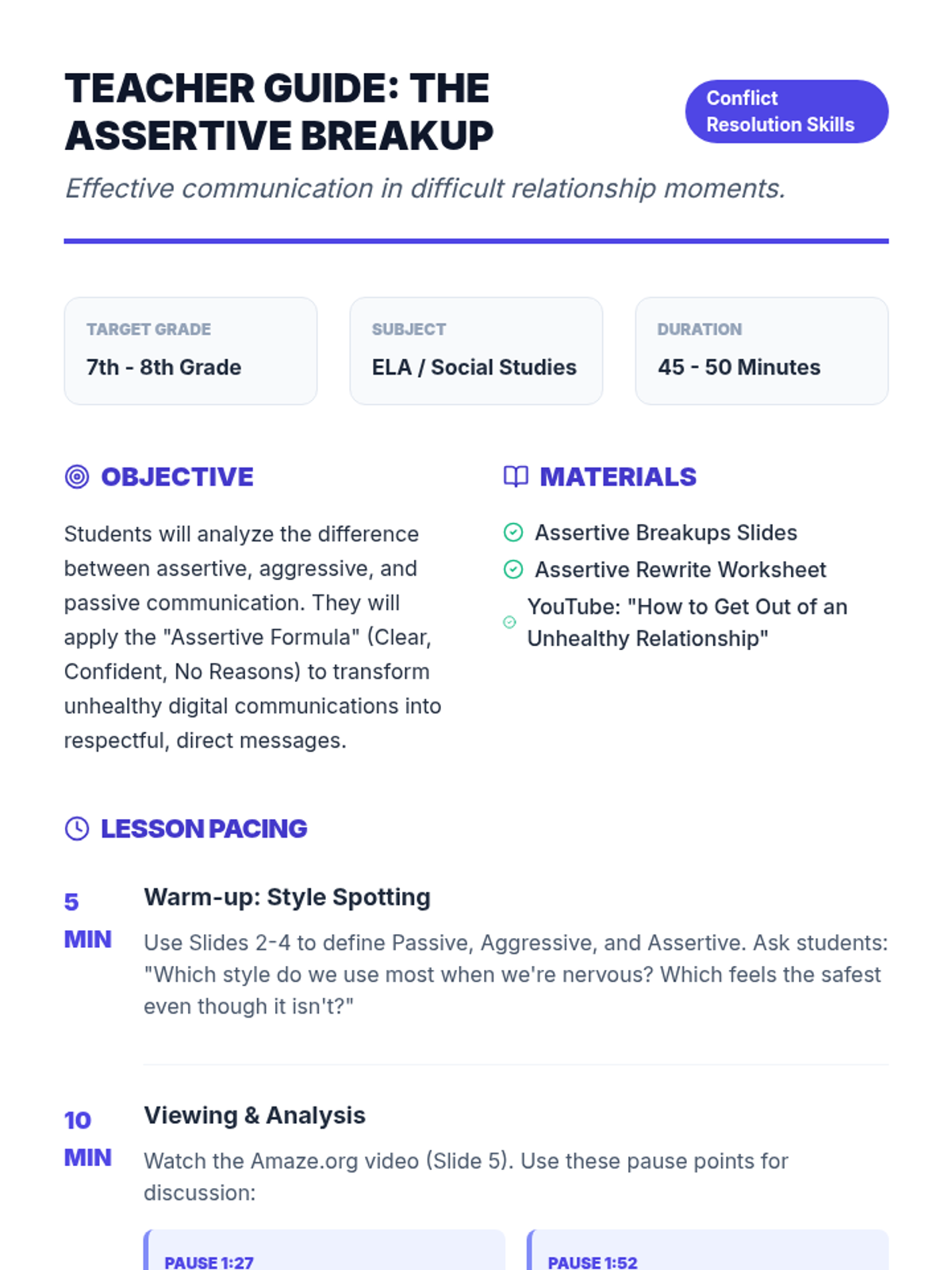 A 5-lesson unit for 7th-grade students focusing on the interpersonal skills required for time management: setting boundaries, communicating overload, and advocating for a balanced schedule. Students progress from identifying burnout to drafting a personal accountability contract.