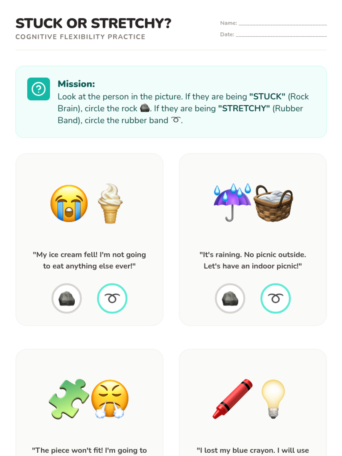 A 5-lesson sequence for Kindergarten students focusing on cognitive flexibility. Students learn to transition from rigid thinking ('Rock Brain') to flexible thinking ('Rubber Band Brain') through structured play, creative problem-solving, and social role-playing.