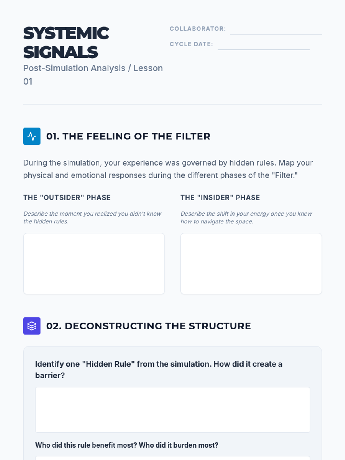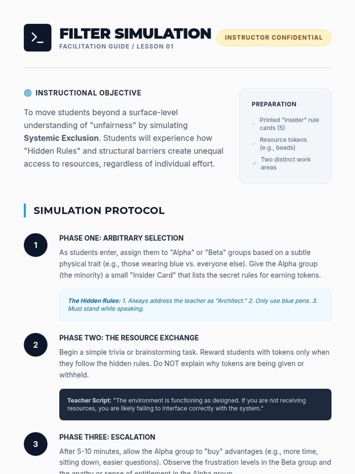 A social-emotional learning sequence for grades 4-10 focused on identifying systemic exclusion, practicing nuanced perspective-taking, and designing inclusive social structures. Students move from awareness to activism through simulation, case studies, and design thinking.