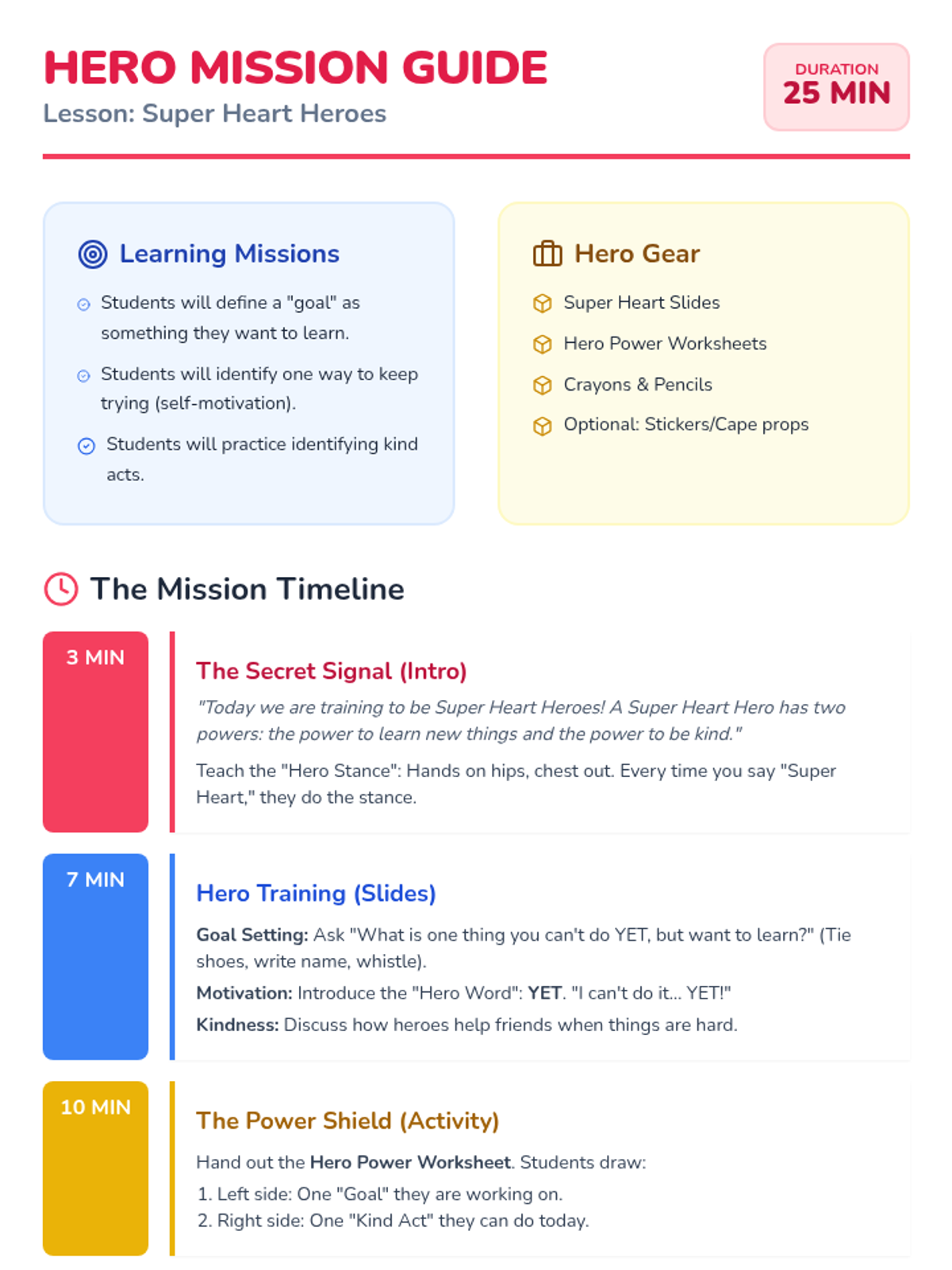 A series of lessons focused on self-motivation, goal setting, and kindness using the 'Heart Hero' metaphor, tailored for early elementary grades.