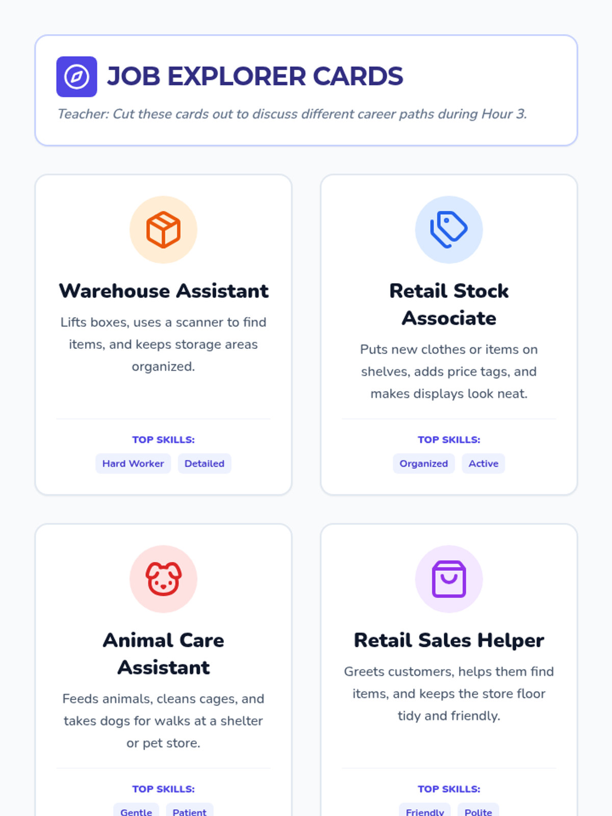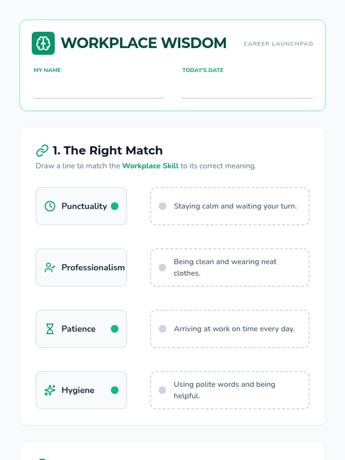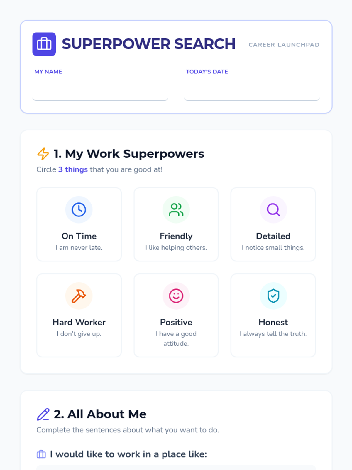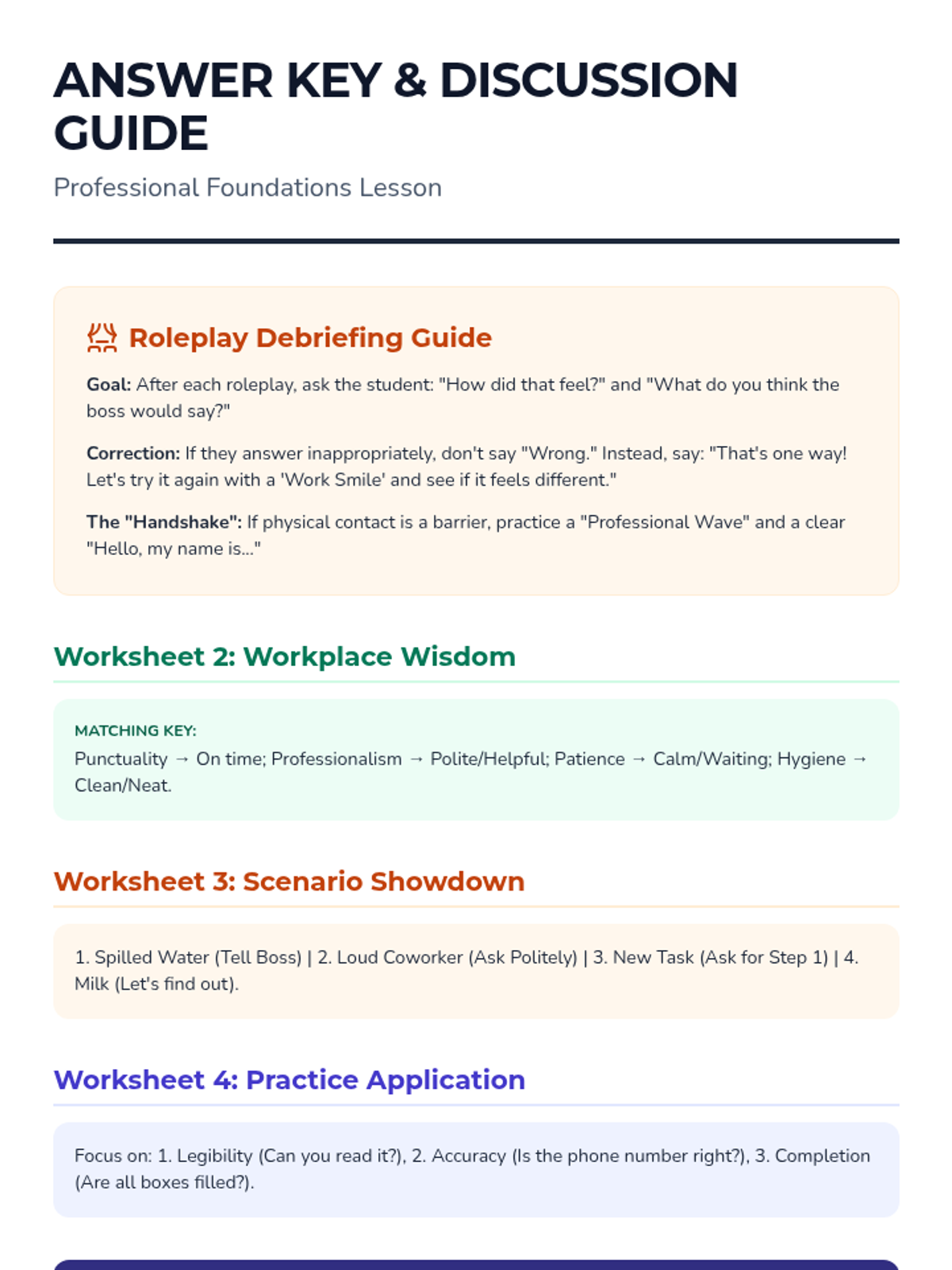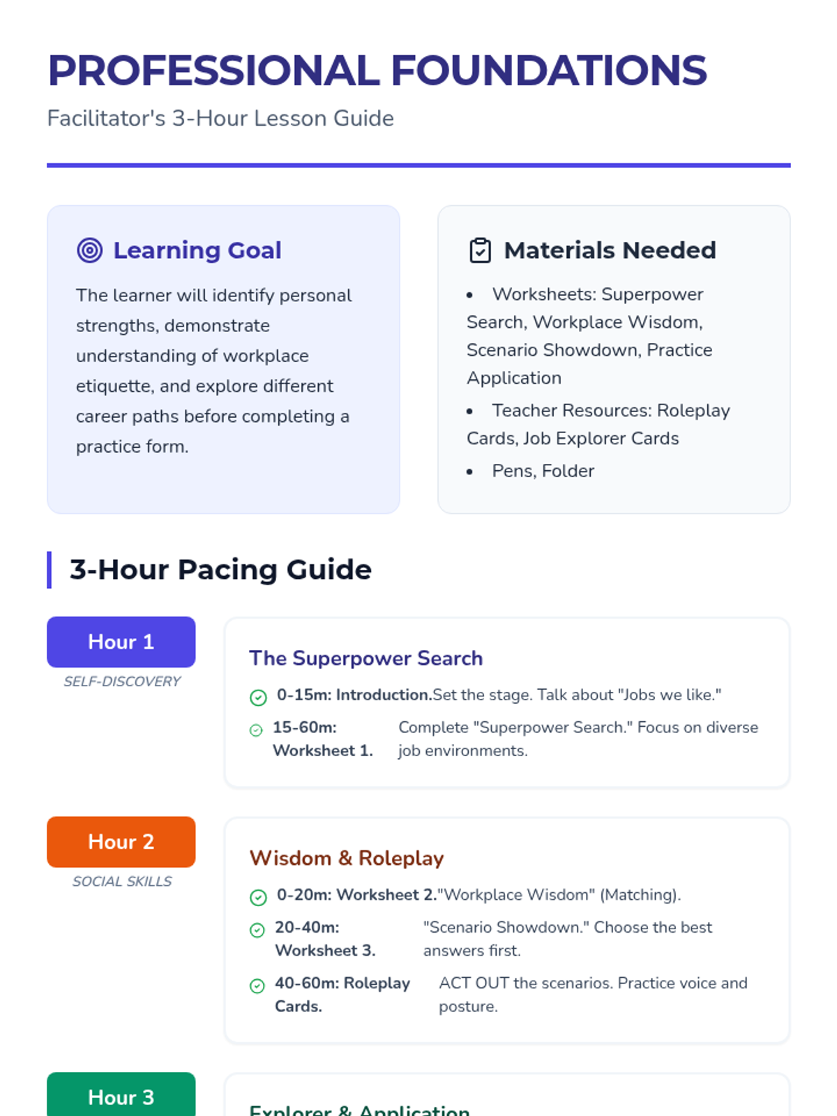 A comprehensive 3-hour one-on-one employment readiness curriculum designed for adults with disabilities. The sequence focuses on self-discovery, workplace etiquette, and practical application skills through engaging, accessible worksheets.