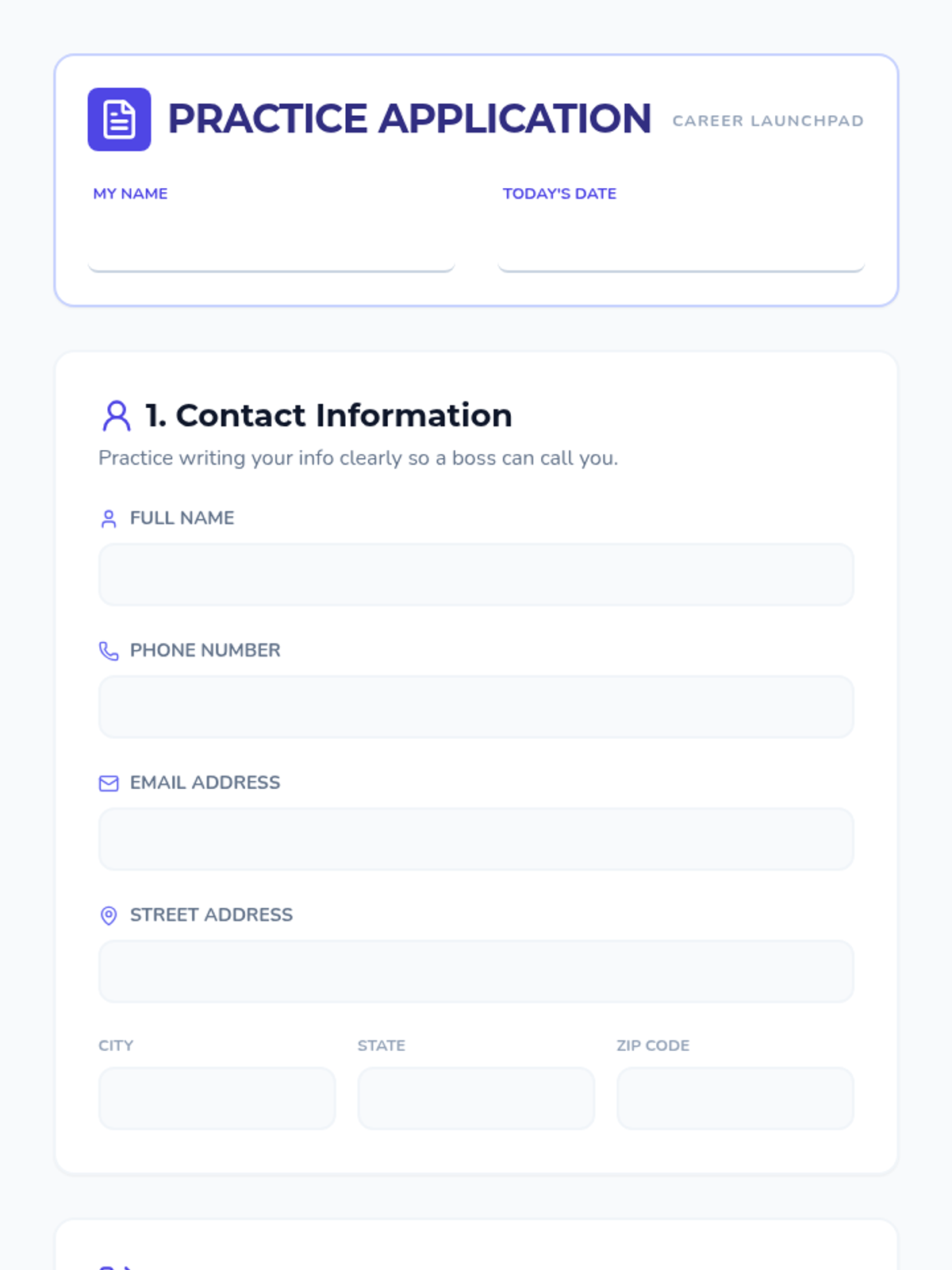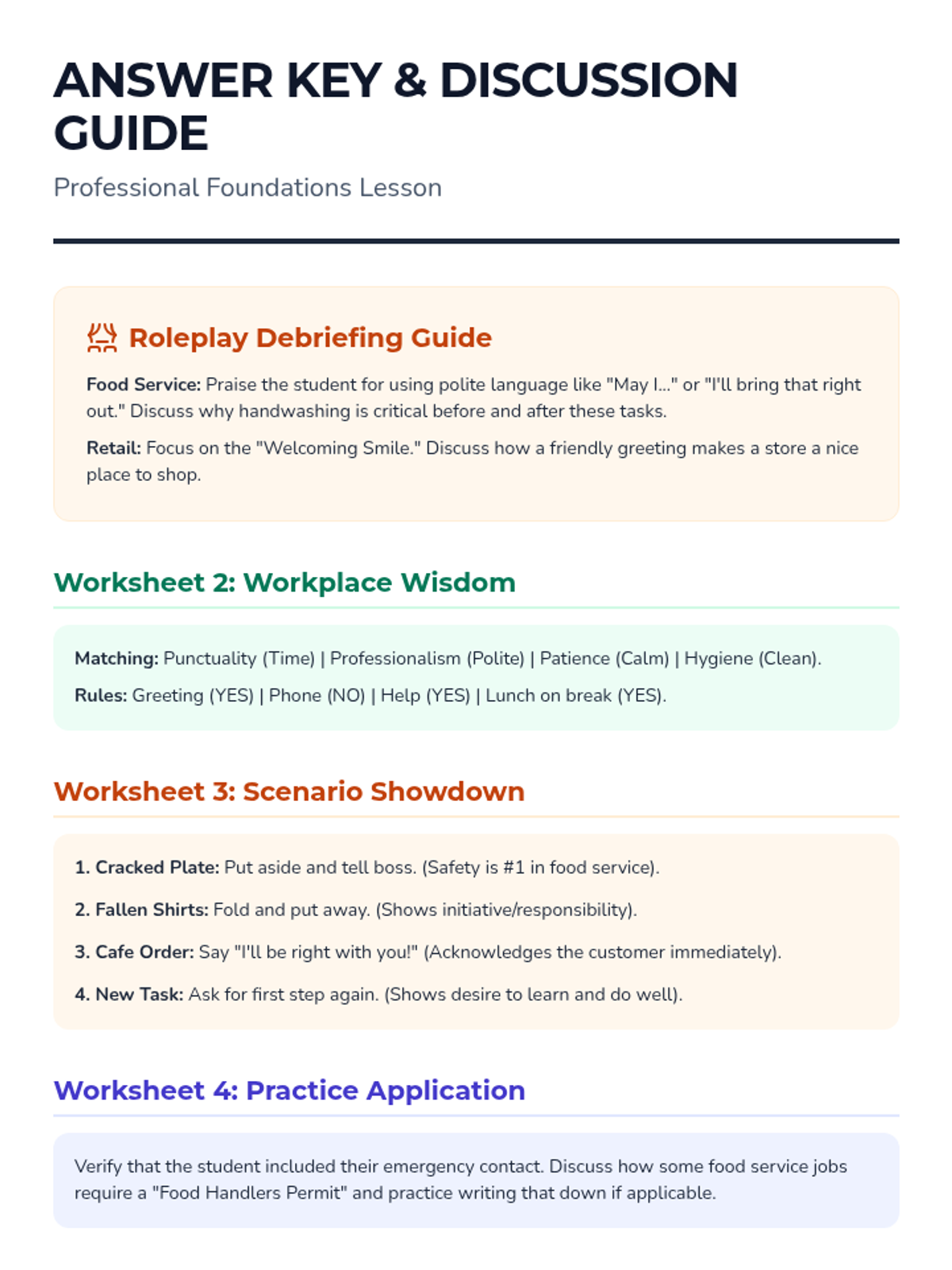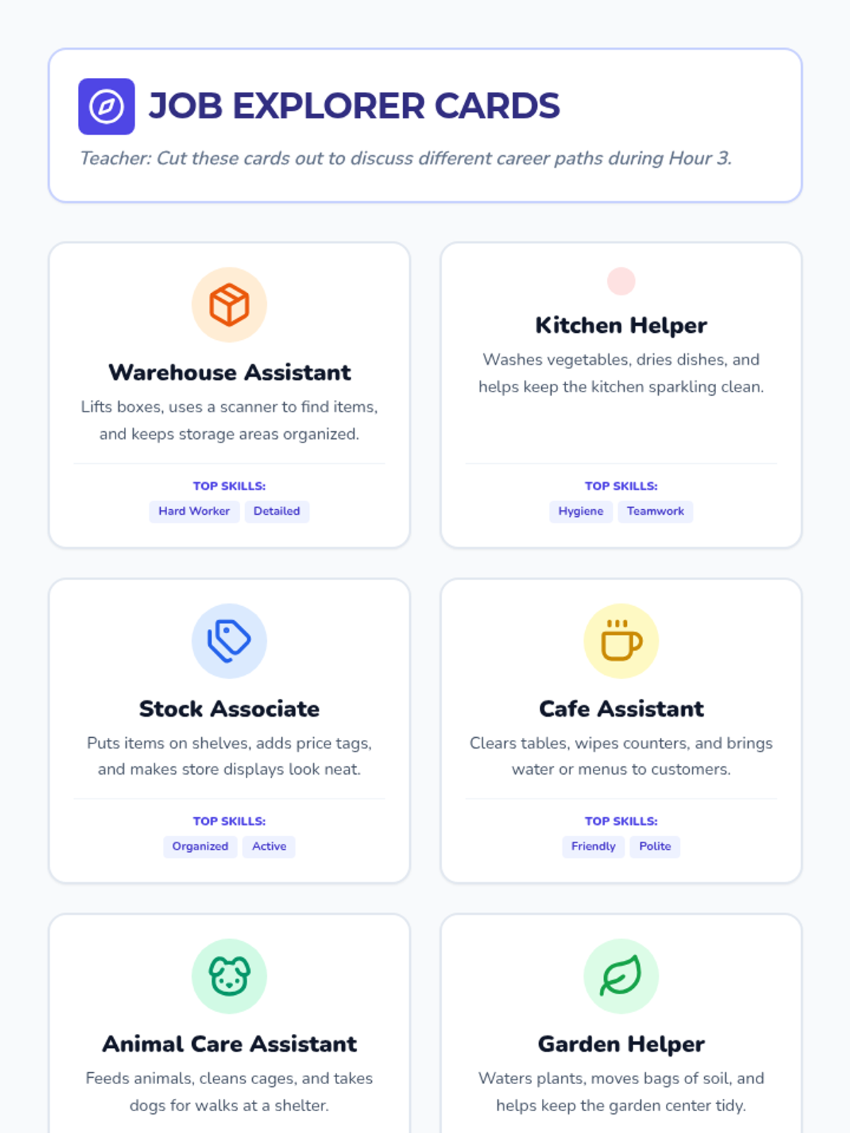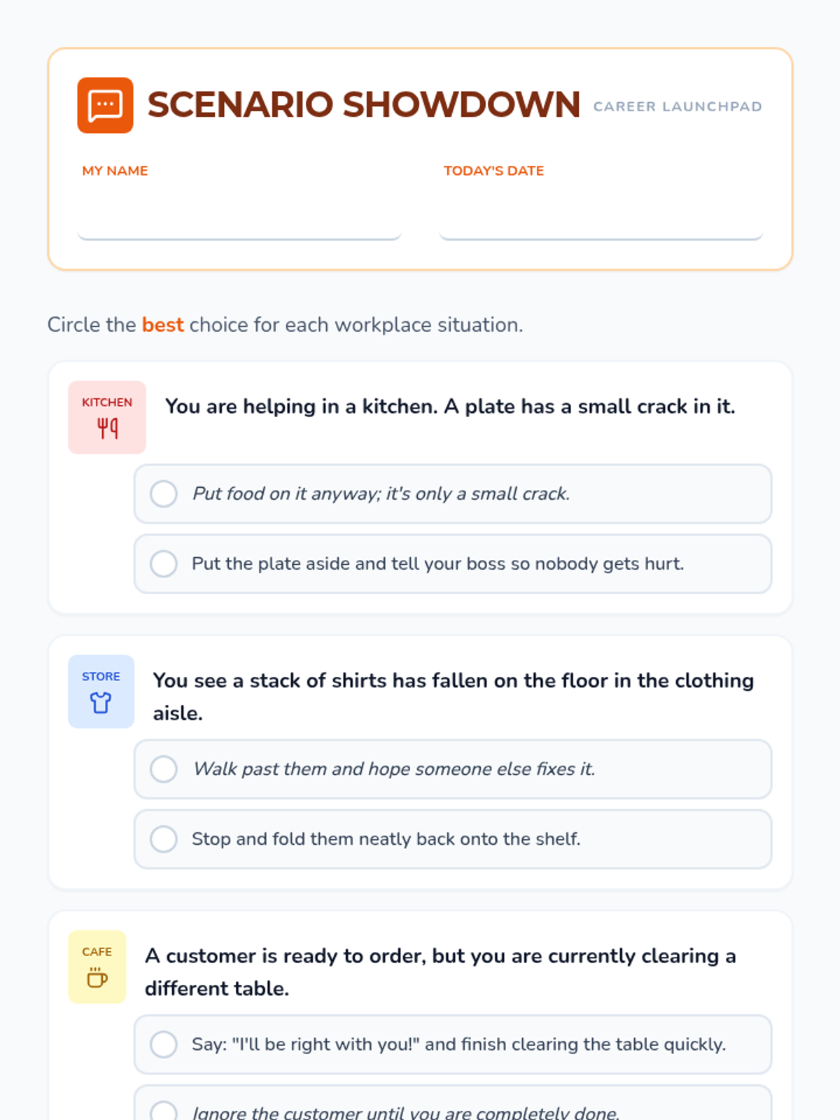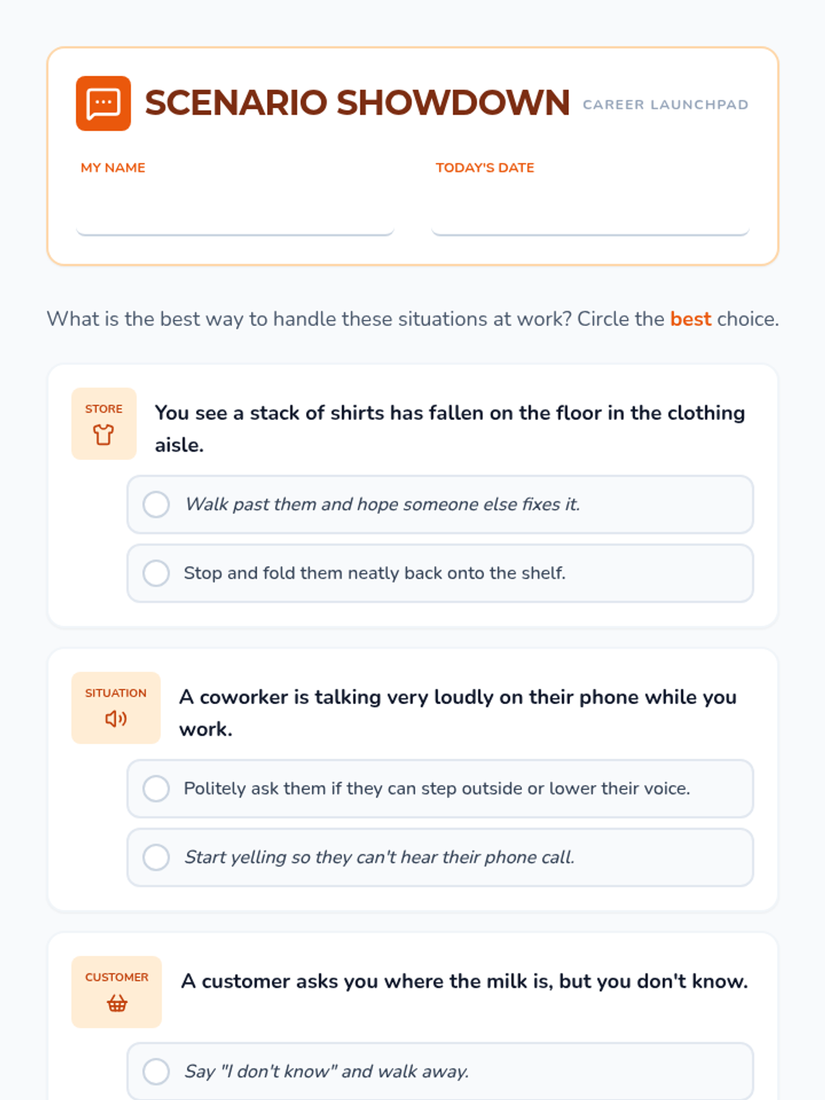 A comprehensive 3-hour one-on-one employment readiness curriculum designed for adults with disabilities. The sequence focuses on self-discovery, workplace etiquette, and practical application skills through engaging, accessible worksheets.