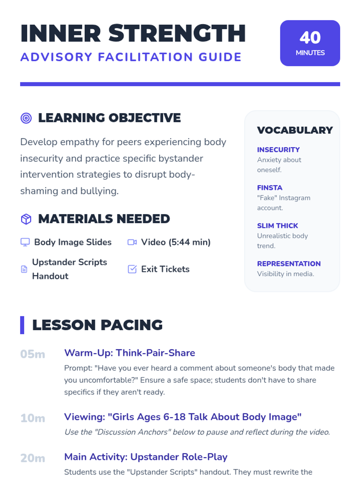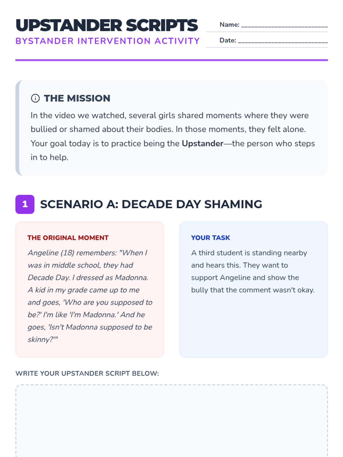 A social-emotional learning sequence focused on developing empathy, body positivity, and active bystander skills in middle school students.