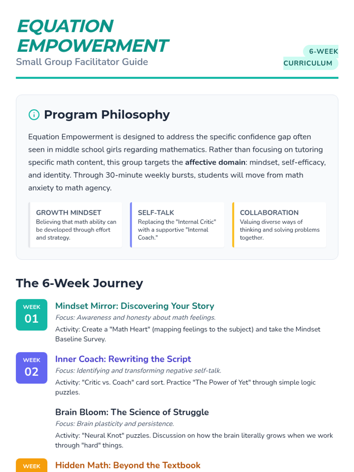 A 6-week small group program designed for middle school girls to build math confidence through growth mindset exercises, positive self-talk, and collaborative puzzles. Each 30-minute session focuses on shifting attitudes toward mathematics and fostering a supportive community.