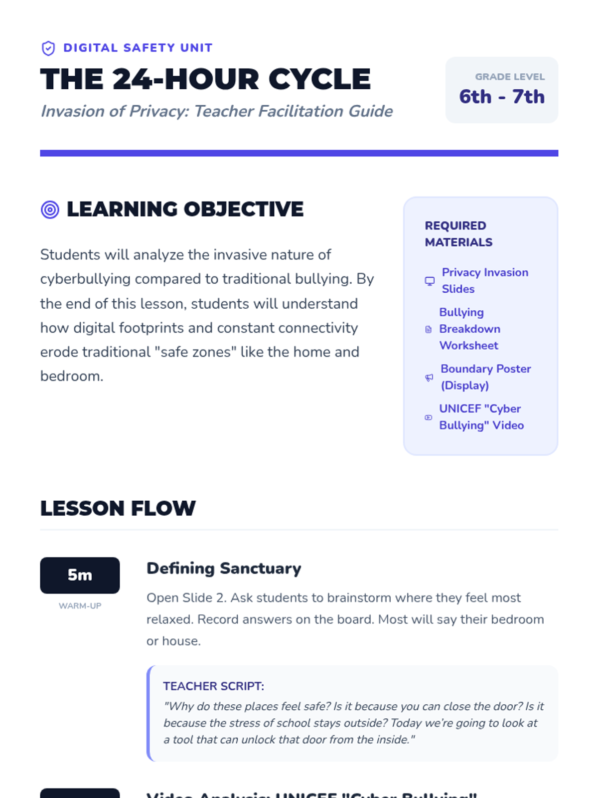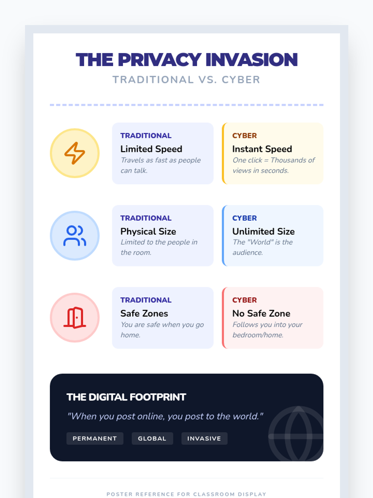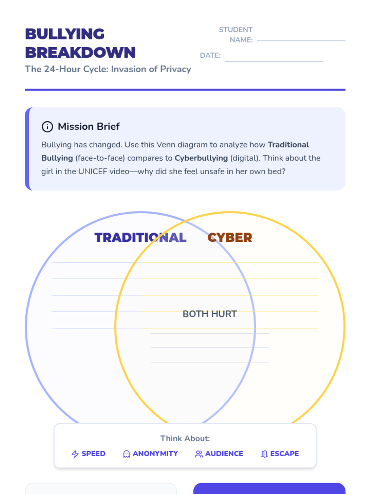 A comprehensive unit exploring the psychological and social impacts of cyberbullying, focusing on the lack of boundaries and the permanent nature of digital footprints. Students analyze the transition from traditional bullying to the 24/7 digital cycle.