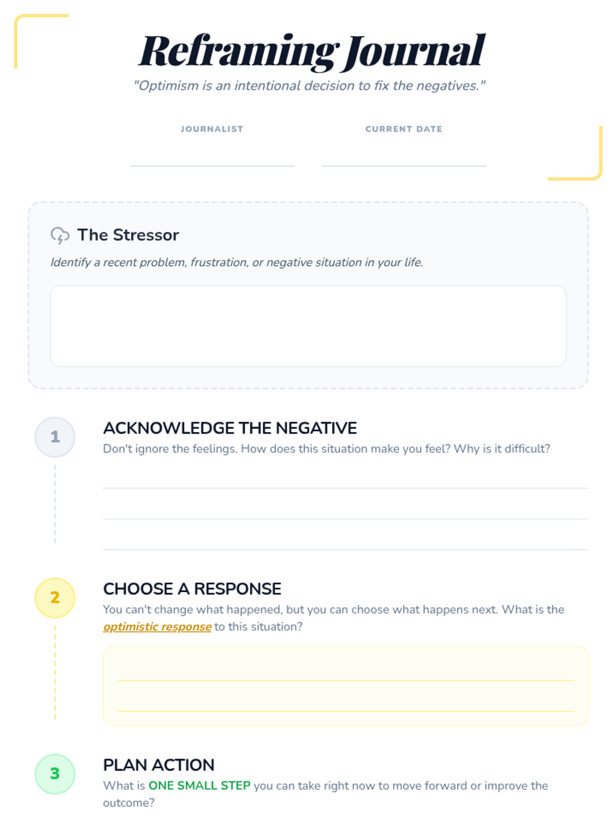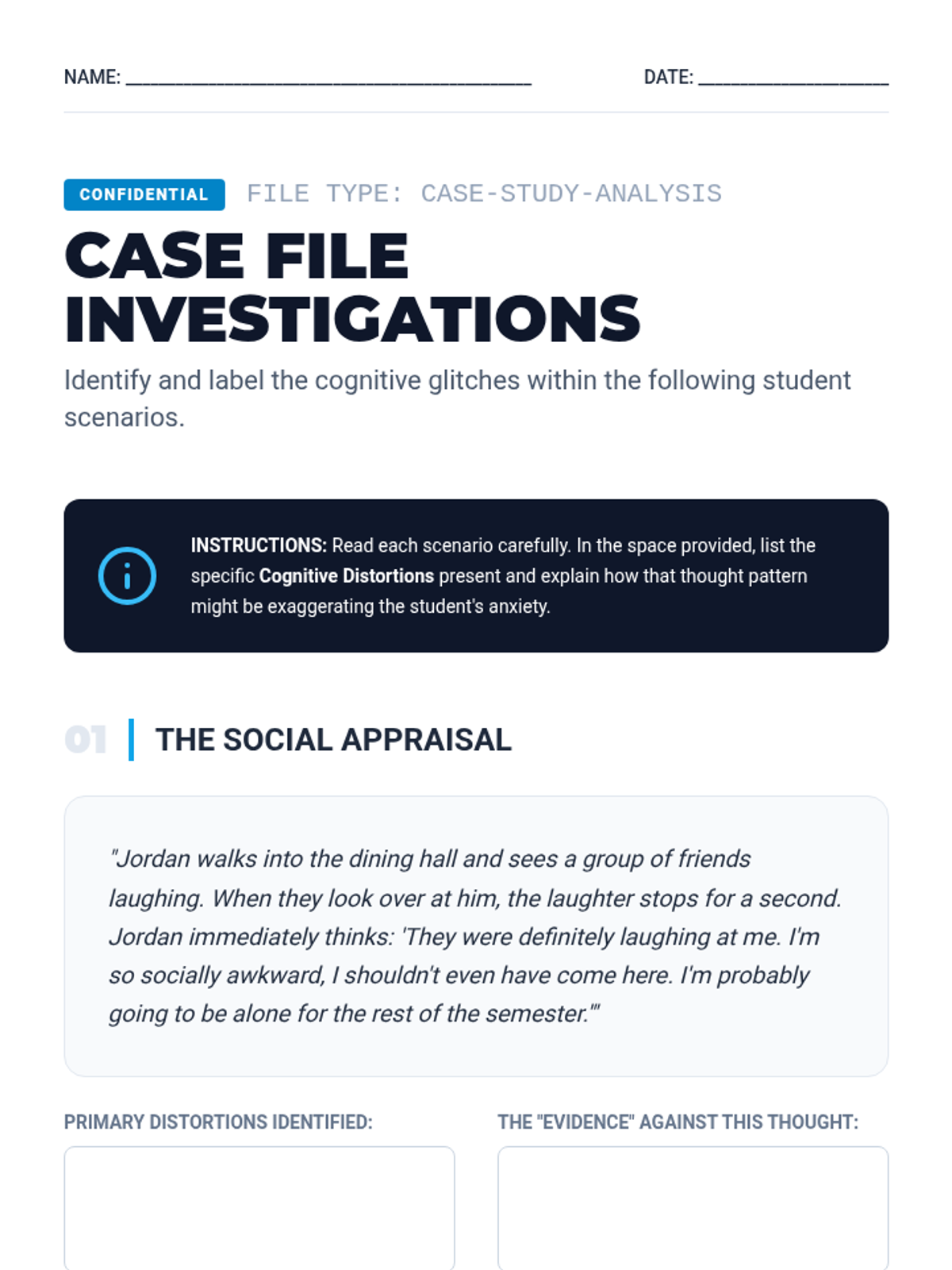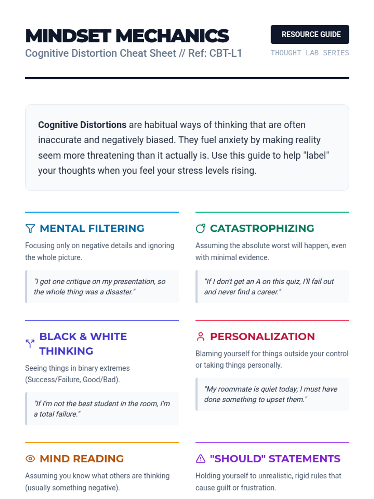 A comprehensive workshop-style sequence for undergraduate students to master cognitive reframing techniques. Students progress from identifying distortions to deconstructing beliefs and building resilient internal narratives.