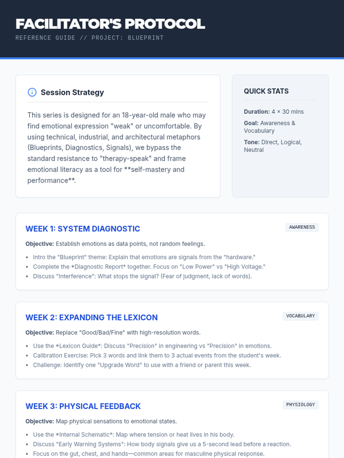 A 4-week counseling series for high school seniors focused on emotional literacy and expression. Using a 'Personal Blueprint' theme, the sequence treats emotions as data points and internal systems to help remove the stigma of sensitivity and focus on self-mastery.