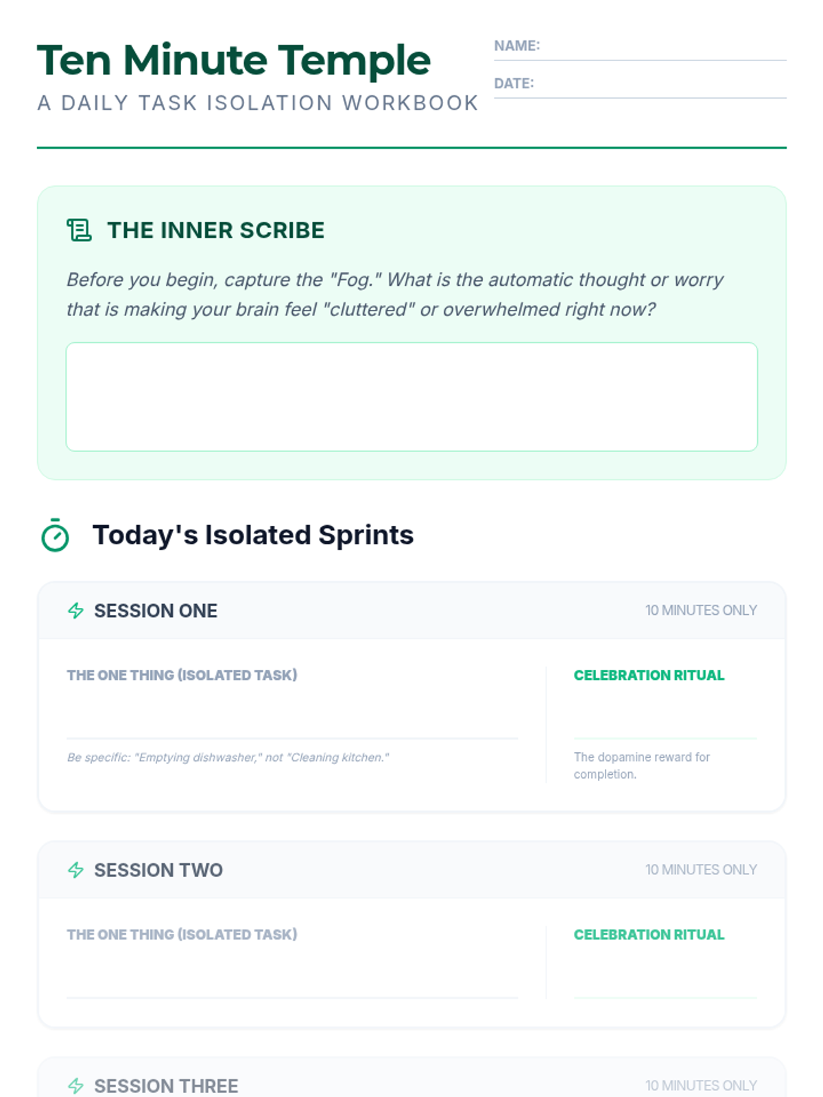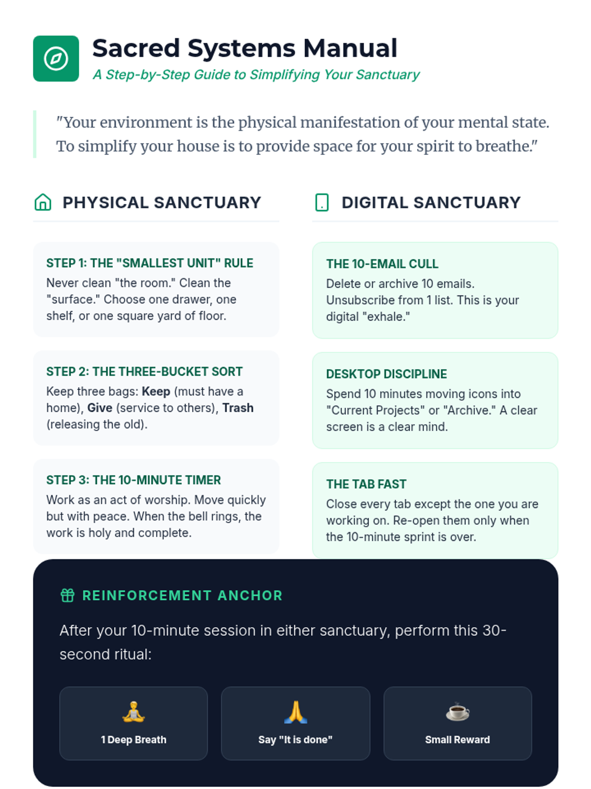 A CBT-based program for adults with inattentive ADD to master task isolation, short-burst productivity (10-minute sessions), and positive reinforcement through a spiritual lens. This sequence guides learners through physical, digital, and professional decluttering.