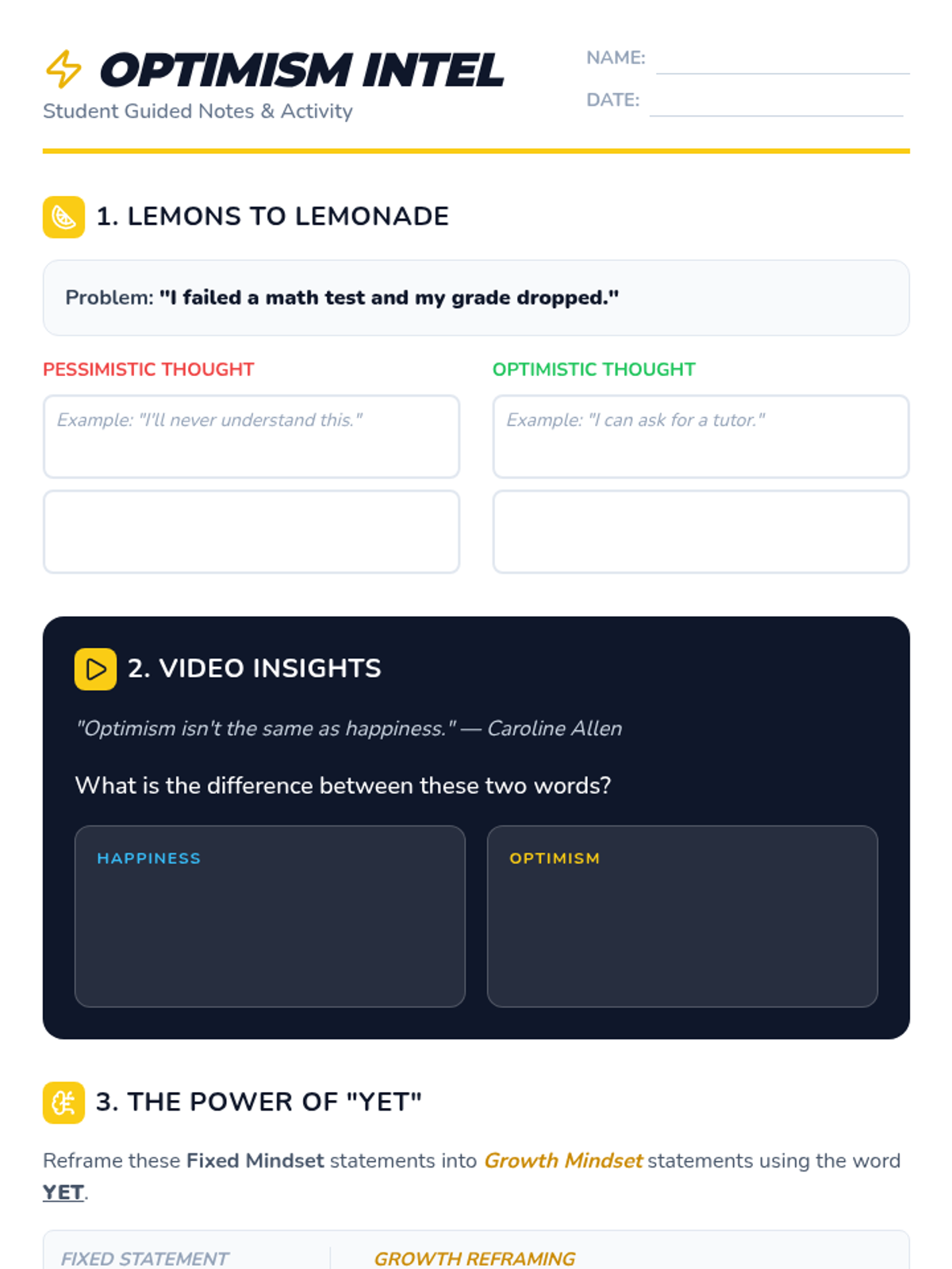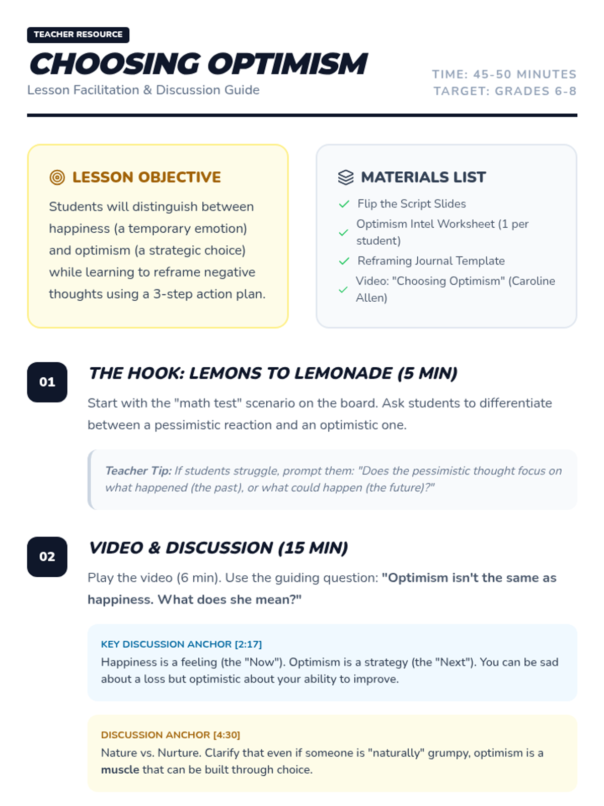 A lesson sequence for middle school students exploring the difference between happiness and optimism, focusing on developing a growth mindset and practical reframing strategies.