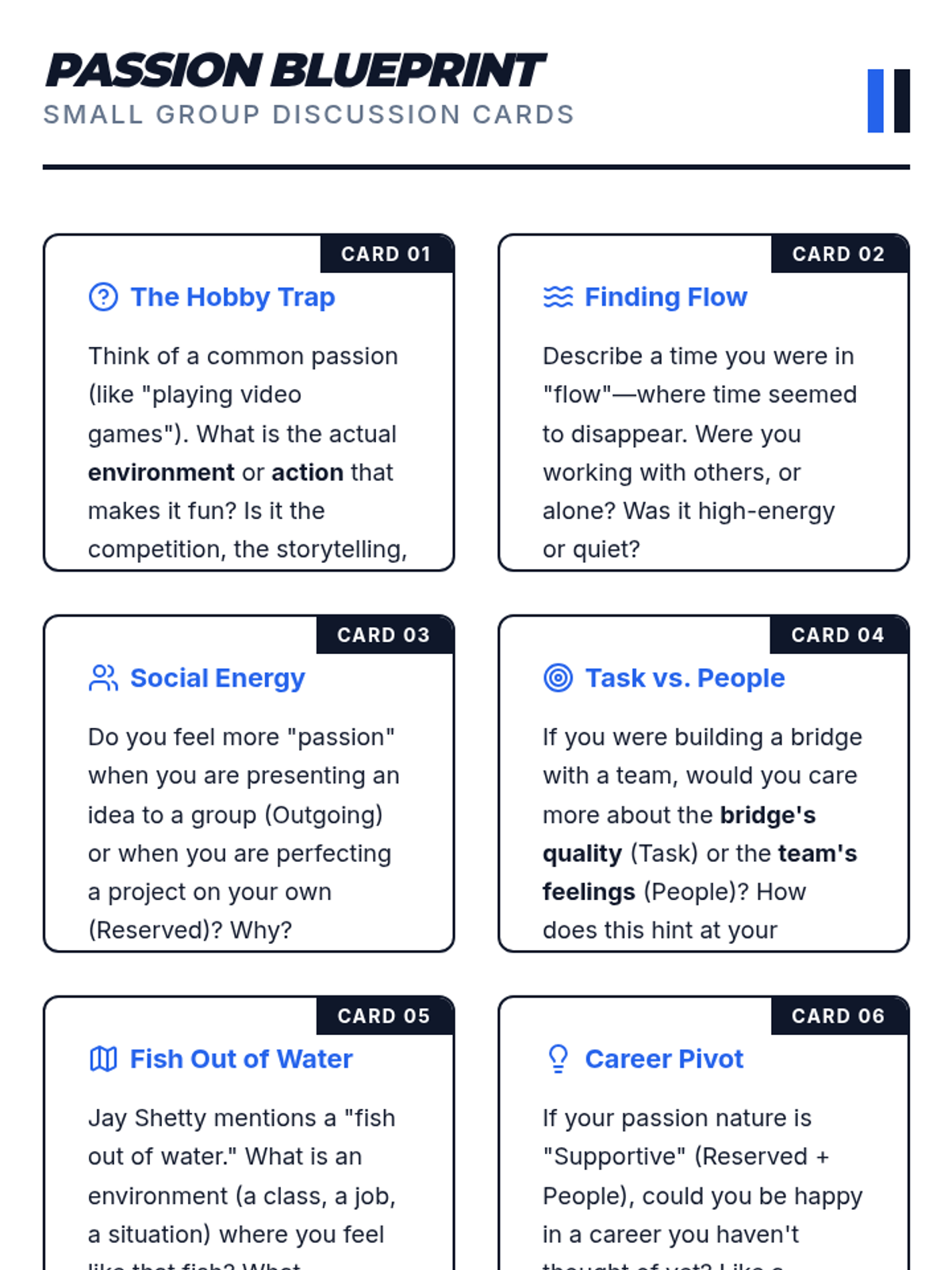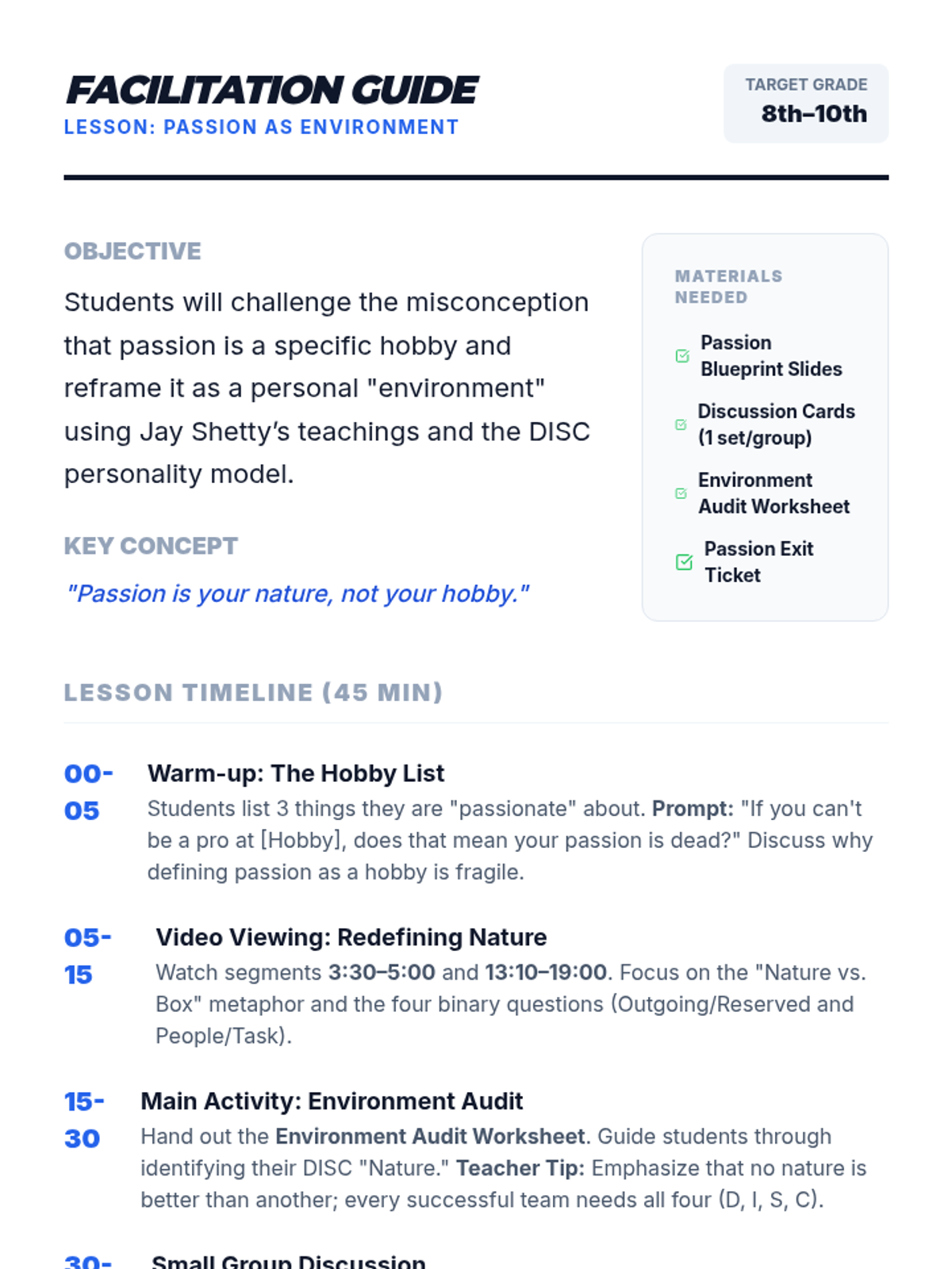 A career exploration and self-discovery unit for 8th-10th graders that reframes 'passion' from a specific hobby to a personal 'environment' or 'nature,' using Jay Shetty's teachings and the DISC model.