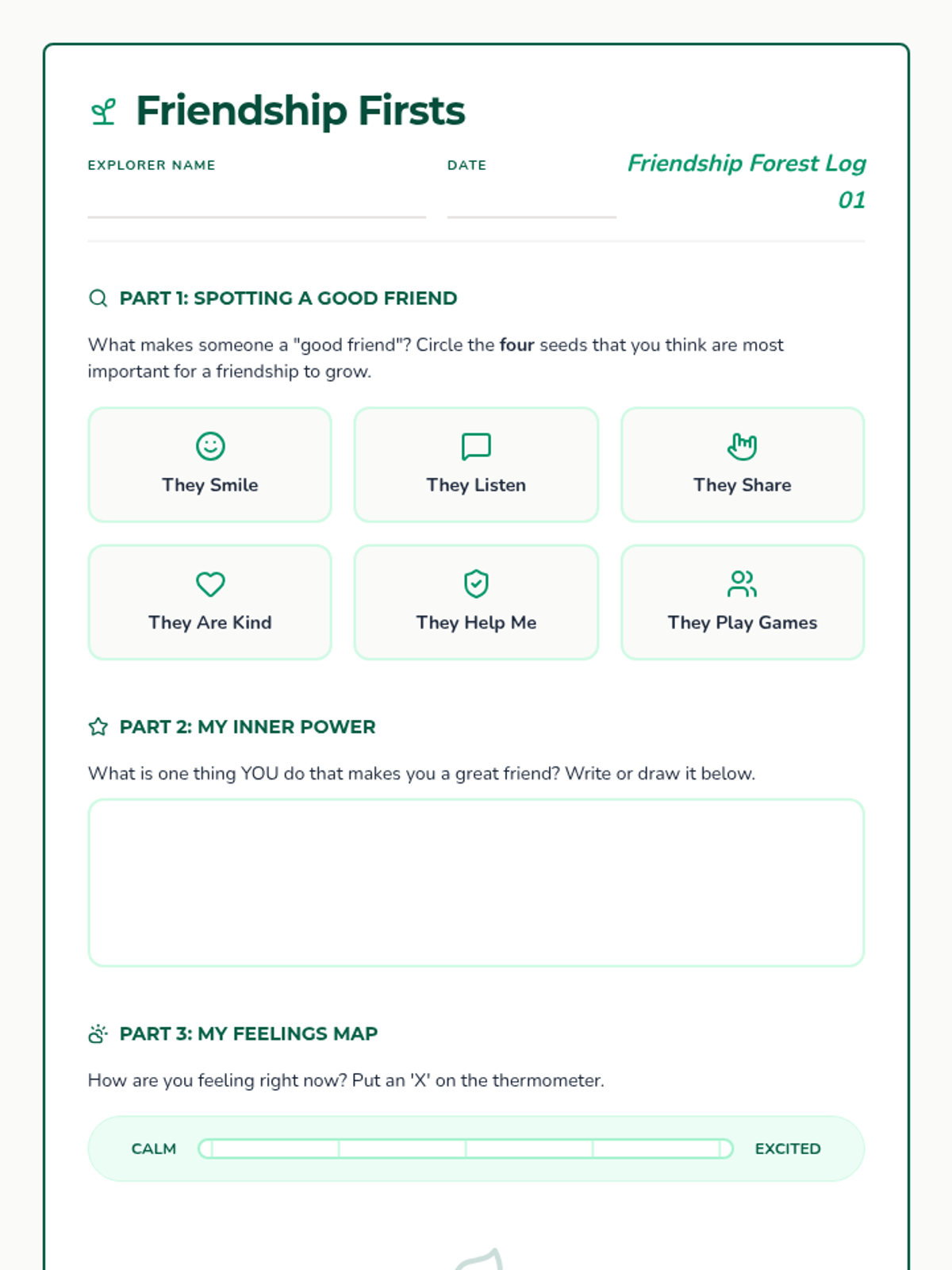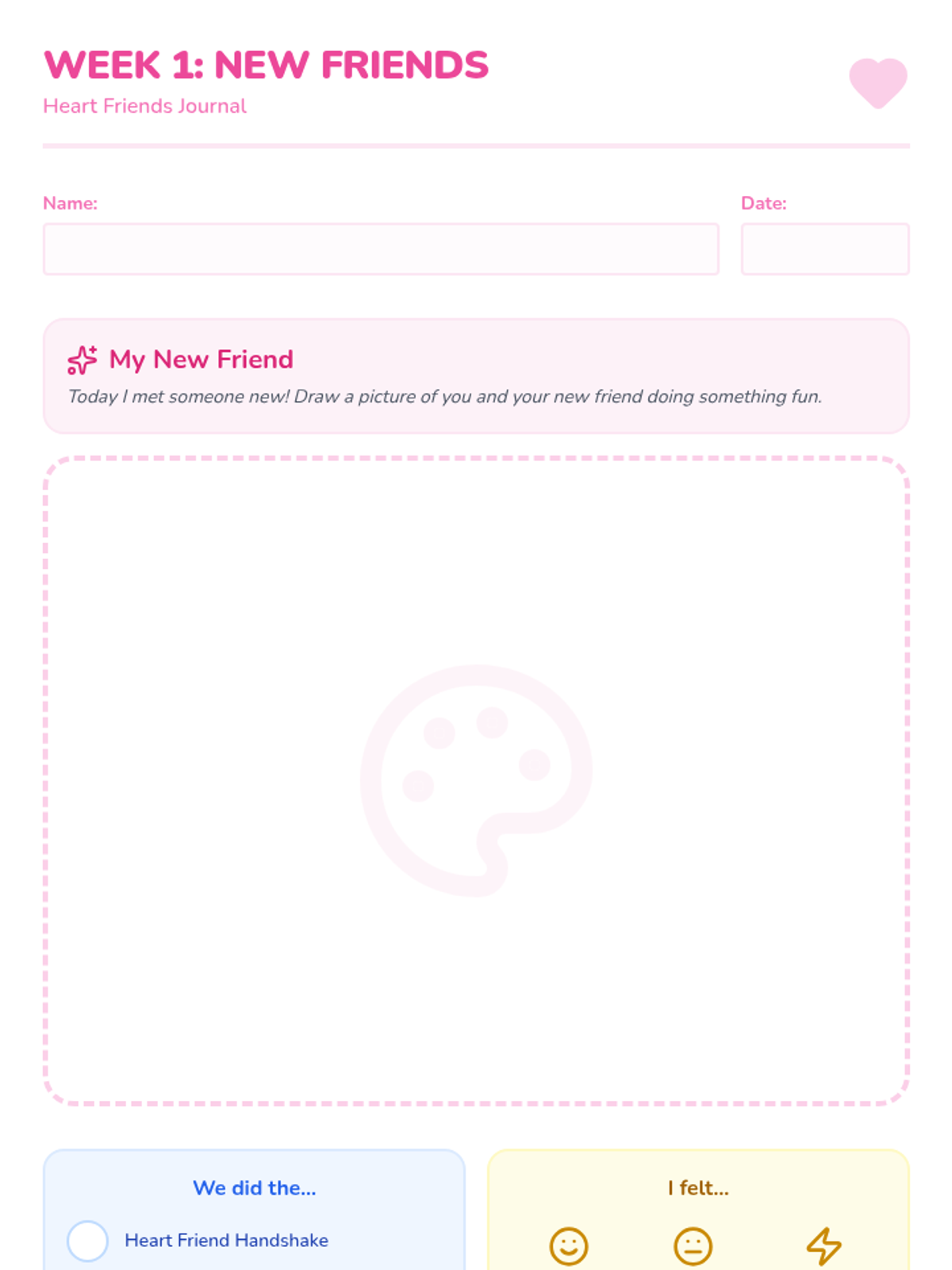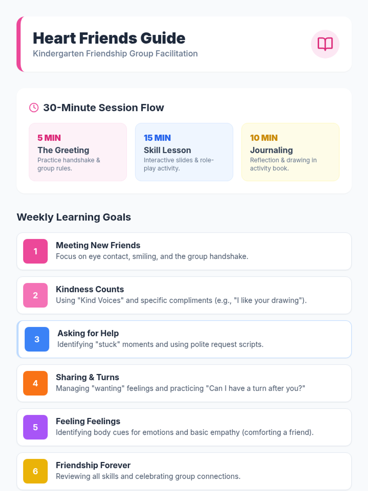 A 6-week social-emotional learning program for kindergarten students, focusing on building foundational friendship skills, empathy, and communication through a weekly journal and group activities.