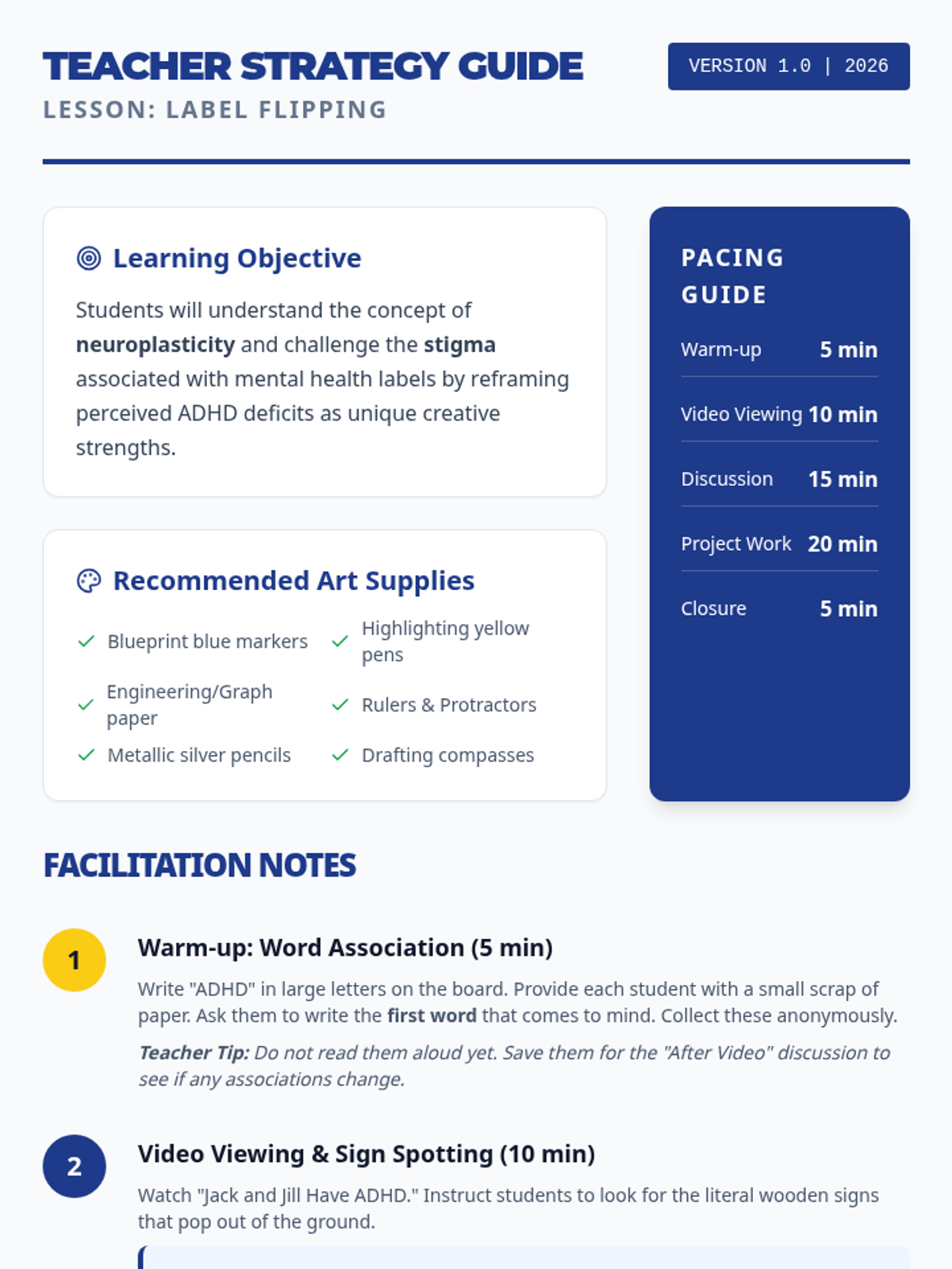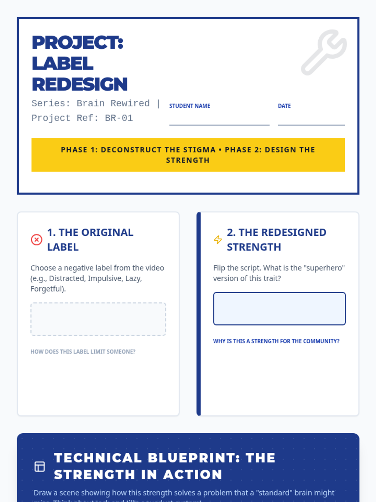 This sequence explores the concepts of neuroplasticity and mental health stigma through the lens of ADHD, focusing on how labels can be reframed into strengths. Students will analyze visual media, participate in guided discussions, and engage in a creative redesign project to understand that brain differences are not deficits but unique ways of processing information.