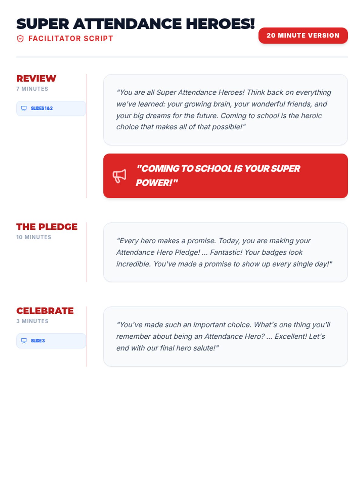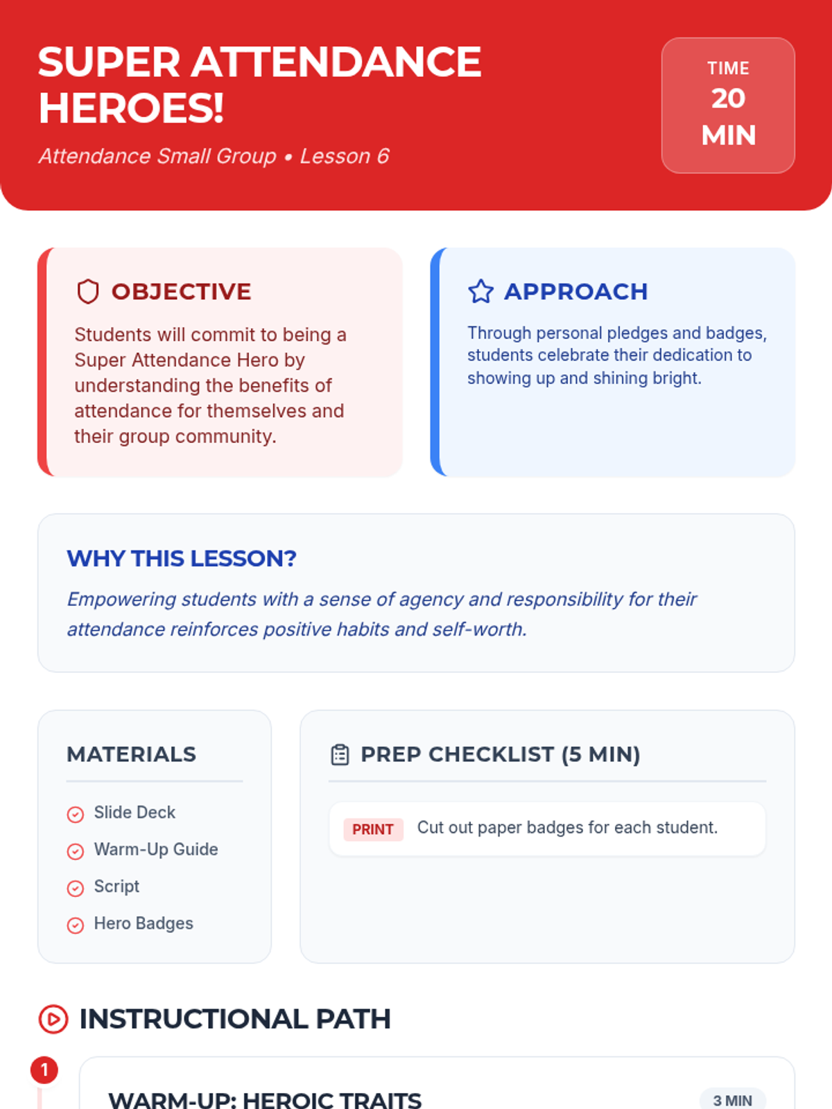 A series of six 20-minute small group lessons for Kindergarteners focused on the importance of school attendance. Students explore how showing up daily supports teamwork, learning, friendship, and future goals through interactive play and discussion.