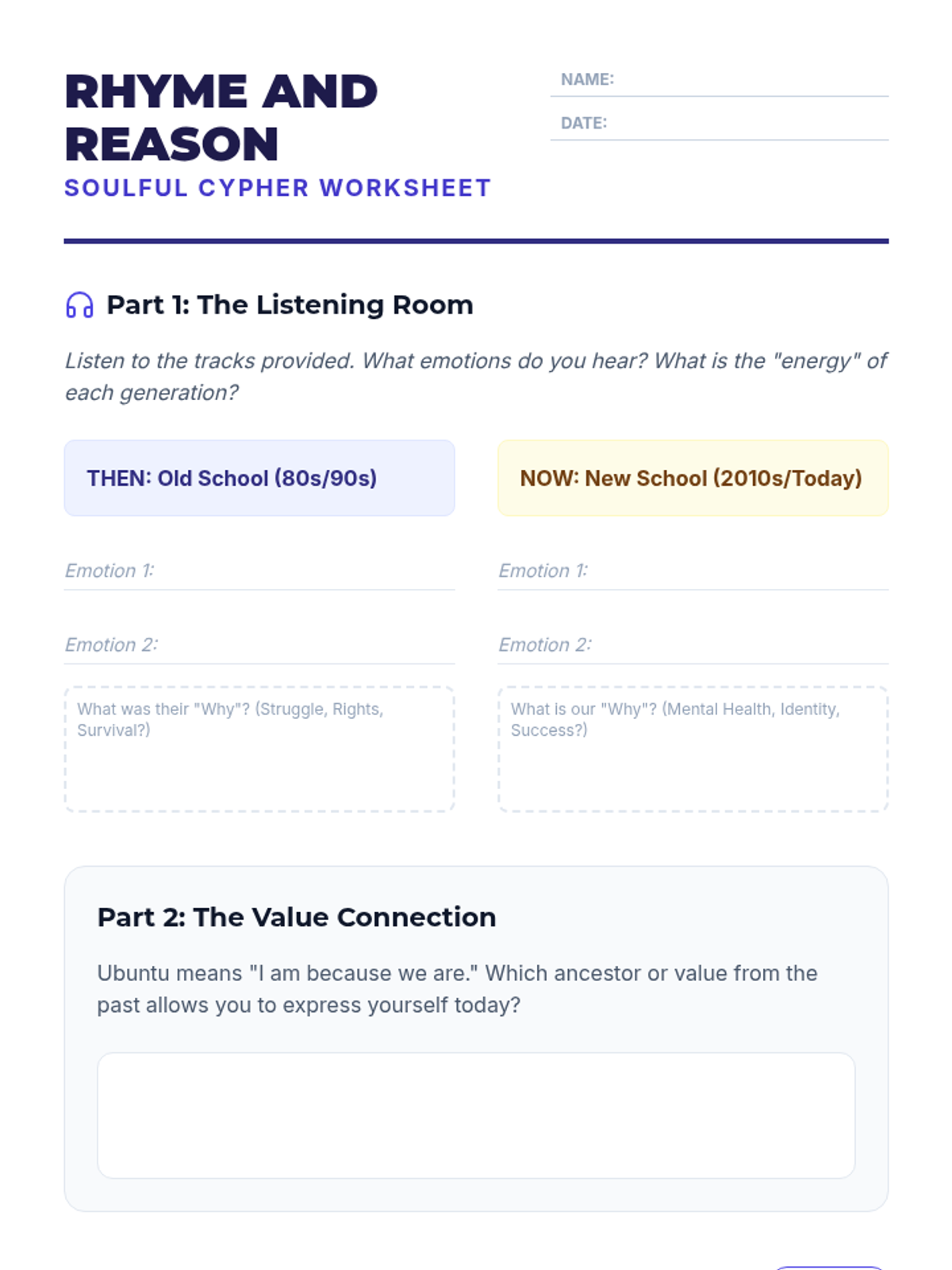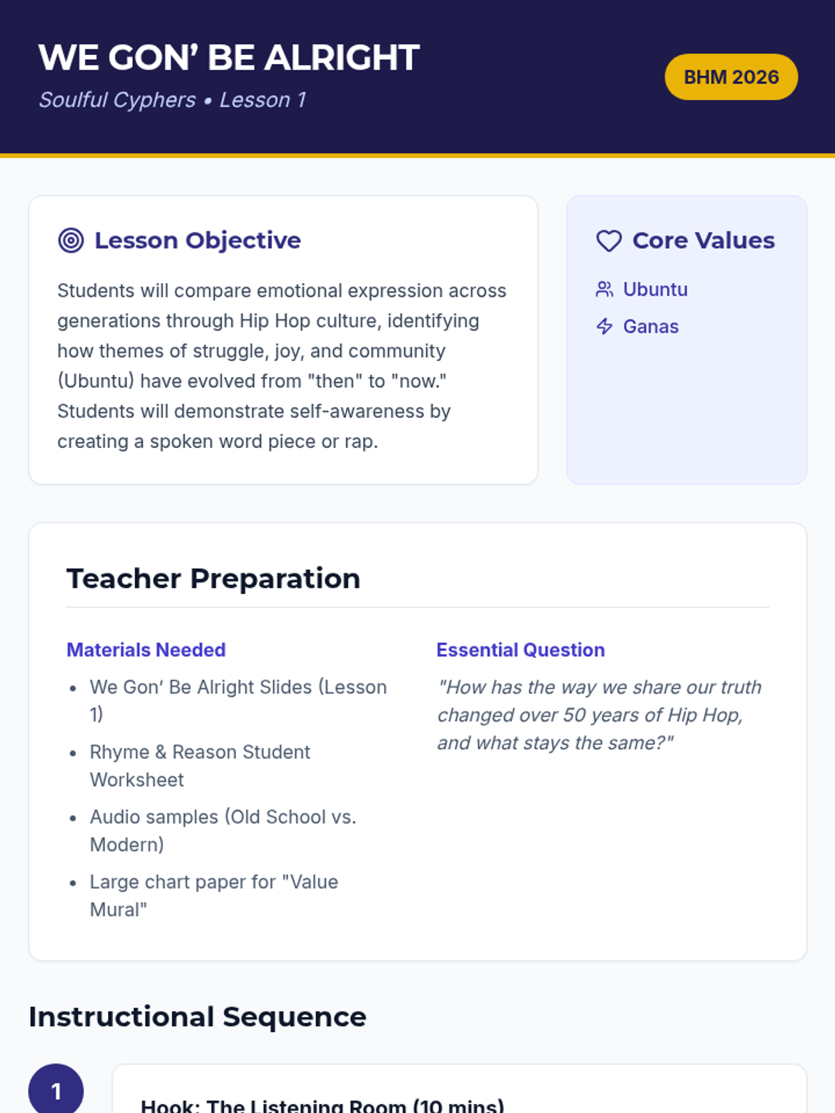 A comprehensive 6-lesson Black History Month curriculum for 5th-8th graders, exploring historical excellence, emotional expression, and community through the lens of five core values: Virtus, Kenkyo, Sankofa, Ubuntu, and Ganas. Inspired by a century of resilience and brilliance.