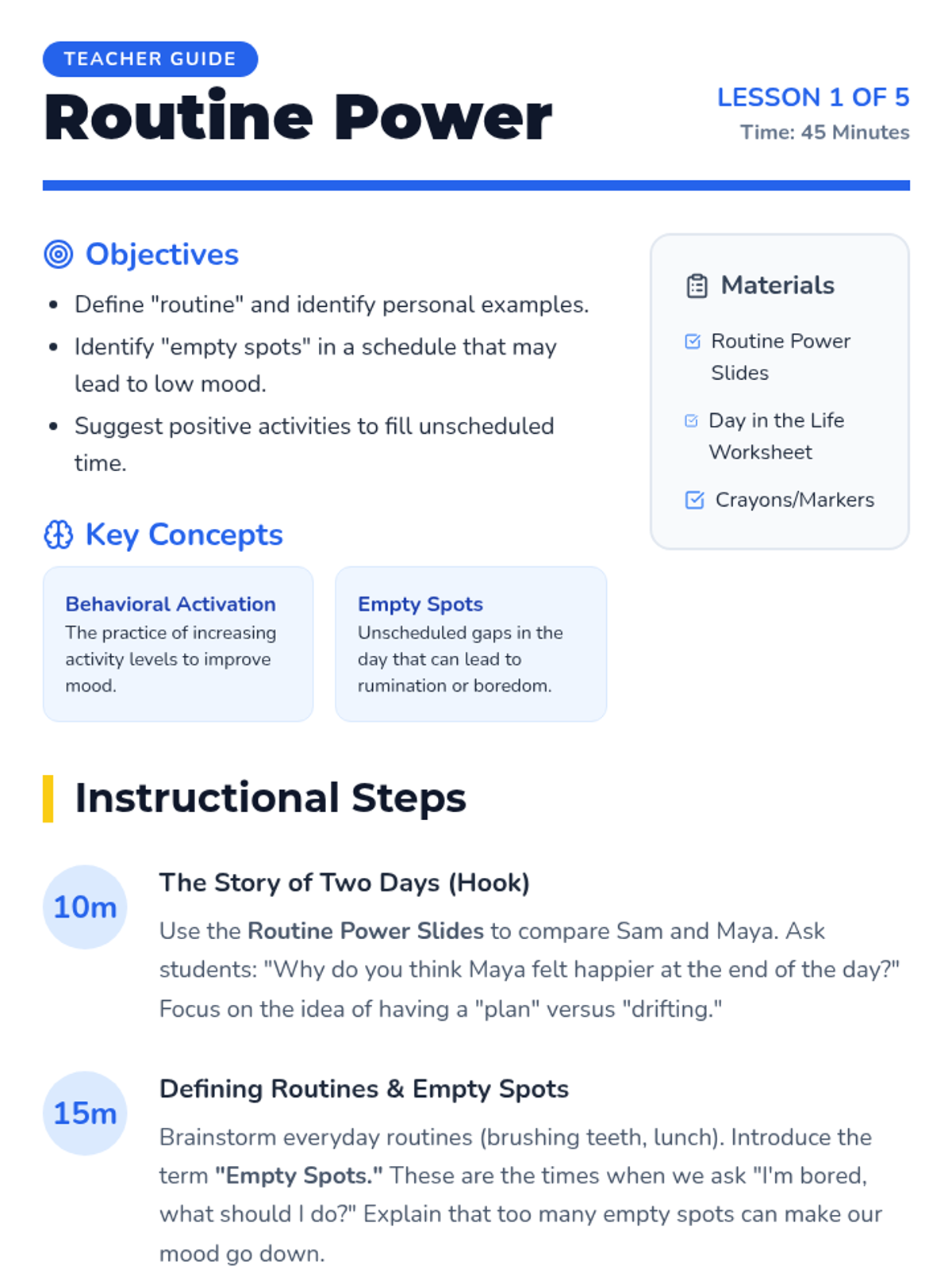 A 1st-grade counseling sequence that uses game-based mechanics and metaphors to teach behavioral activation, emotional resilience, and the importance of daily positive routines.