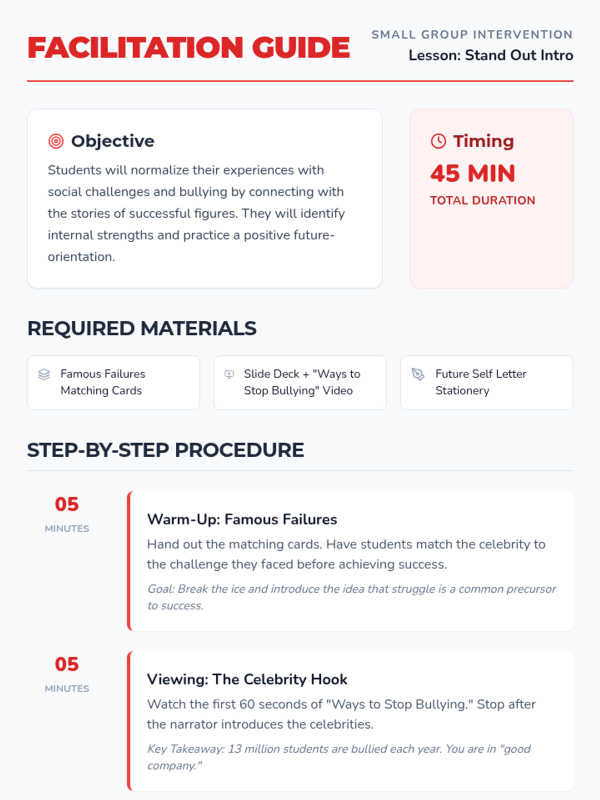 A small group intervention sequence designed for school counselors to help students normalize their experiences with bullying, identify coping mechanisms, and build self-esteem using the 'Stand Out' method.