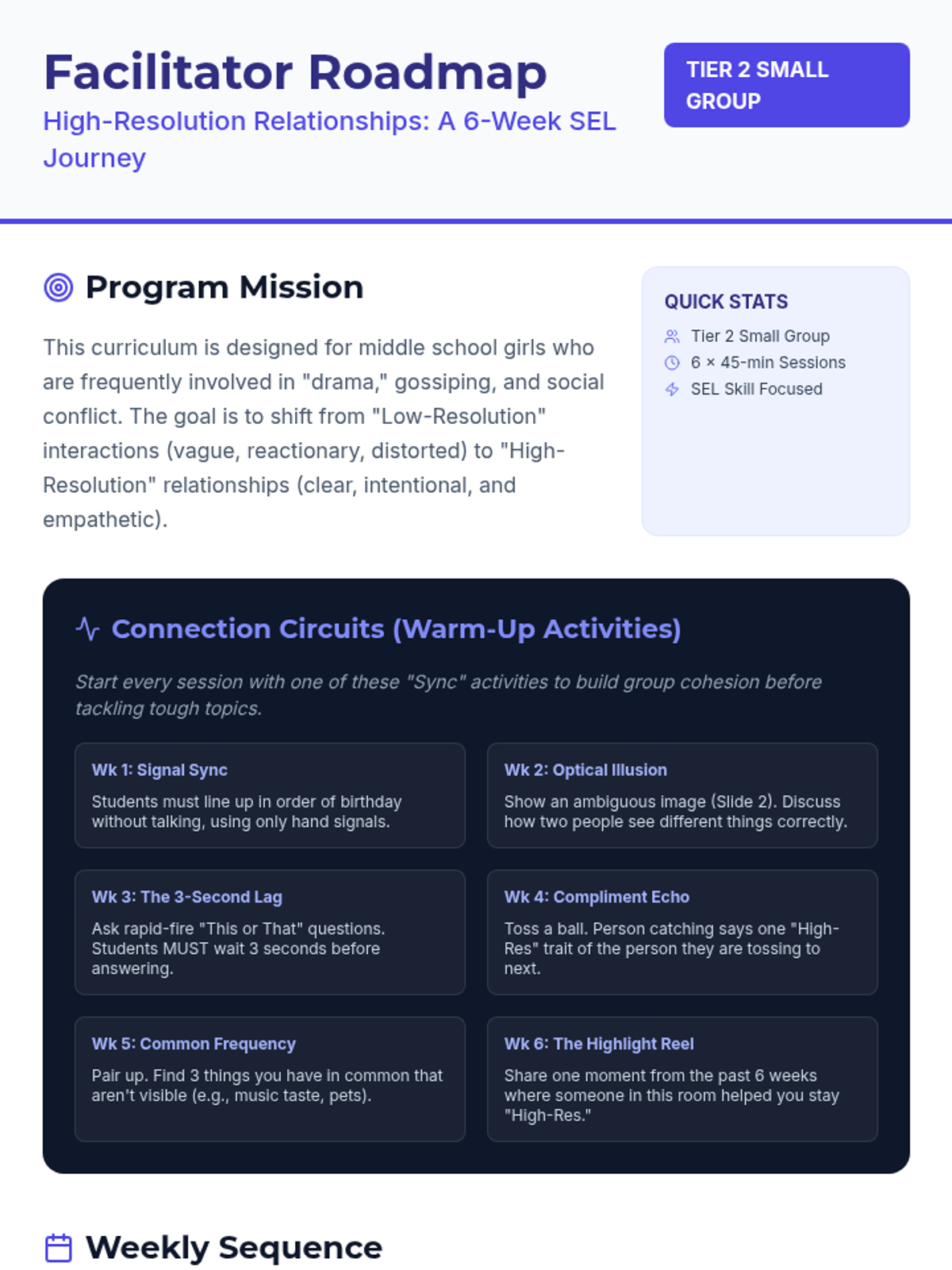A 6-week Tier 2 SEL small group program for middle school girls focused on navigating social dynamics, reducing gossip, and building healthy conflict resolution skills. The program uses a modern 'High-Resolution' theme to help students focus on clear communication and empathy.
