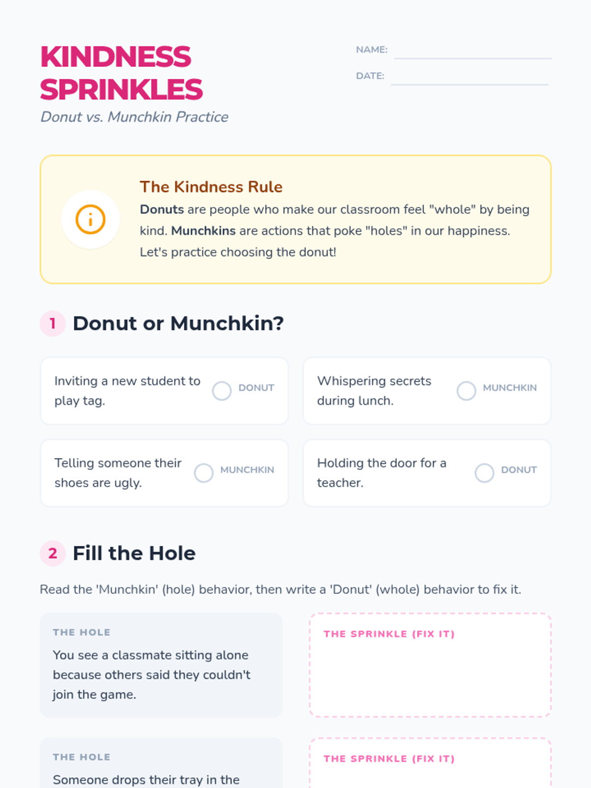 A comprehensive 5-day curriculum for 4th graders focused on kindness, conflict resolution, and bullying prevention. Using the 'Donut vs. Munchkin' and 'BUSTER' frameworks, students learn to build a supportive classroom community through interactive lessons and activities.