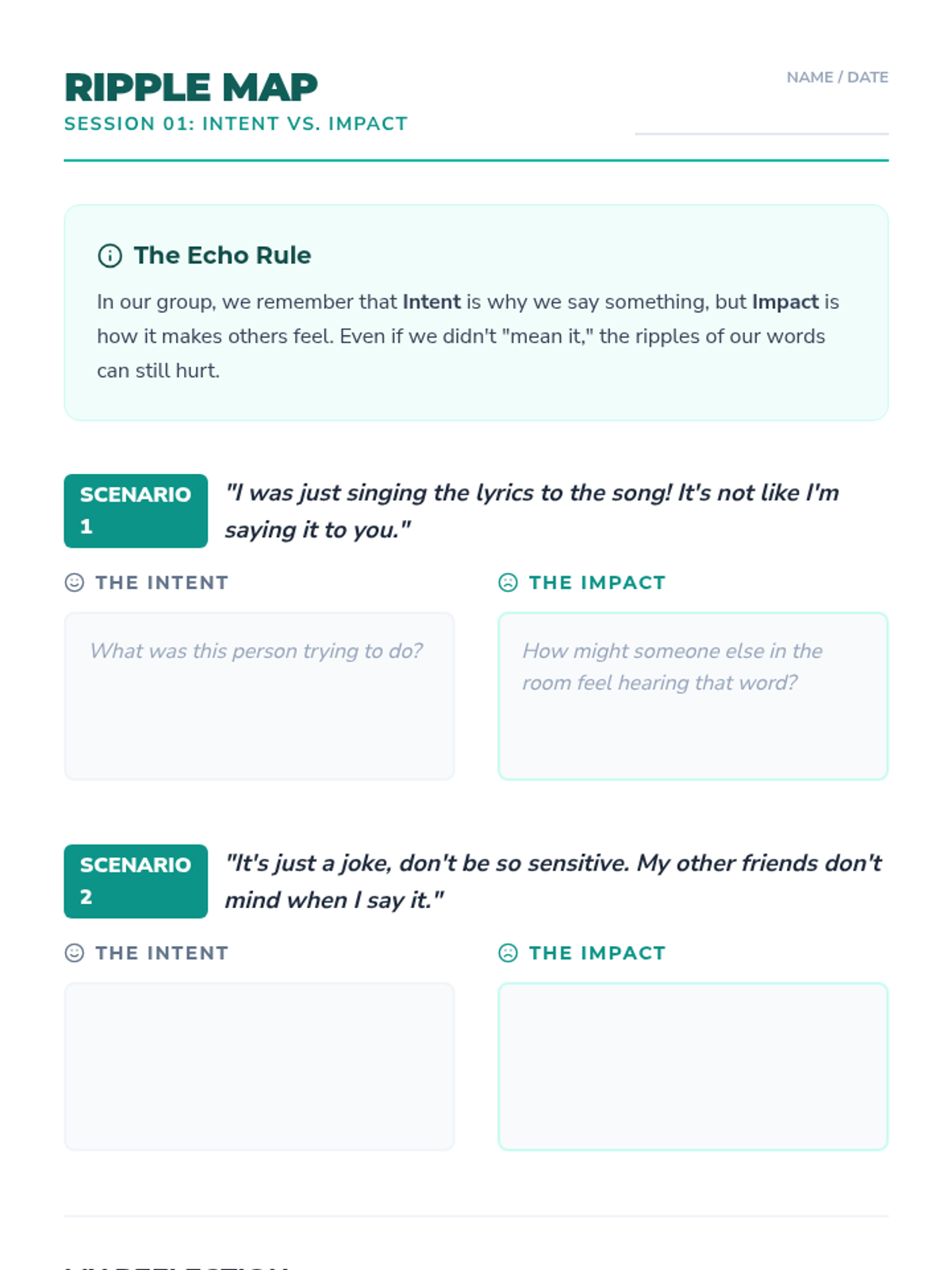 A three-session series for eighth graders on impulse control, the impact of speech, and taking accountability for one's social footprint. The curriculum moves from understanding impact to practicing filtering and ends with a framework for restorative accountability.