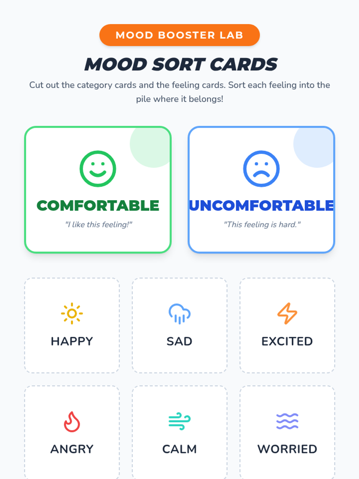 This sequence introduces first-grade students to the fundamental connection between their actions and their emotions, serving as a foundational introduction to behavioral activation. Students explore how specific activities can shift their mood and create a personalized action plan for emotional regulation.