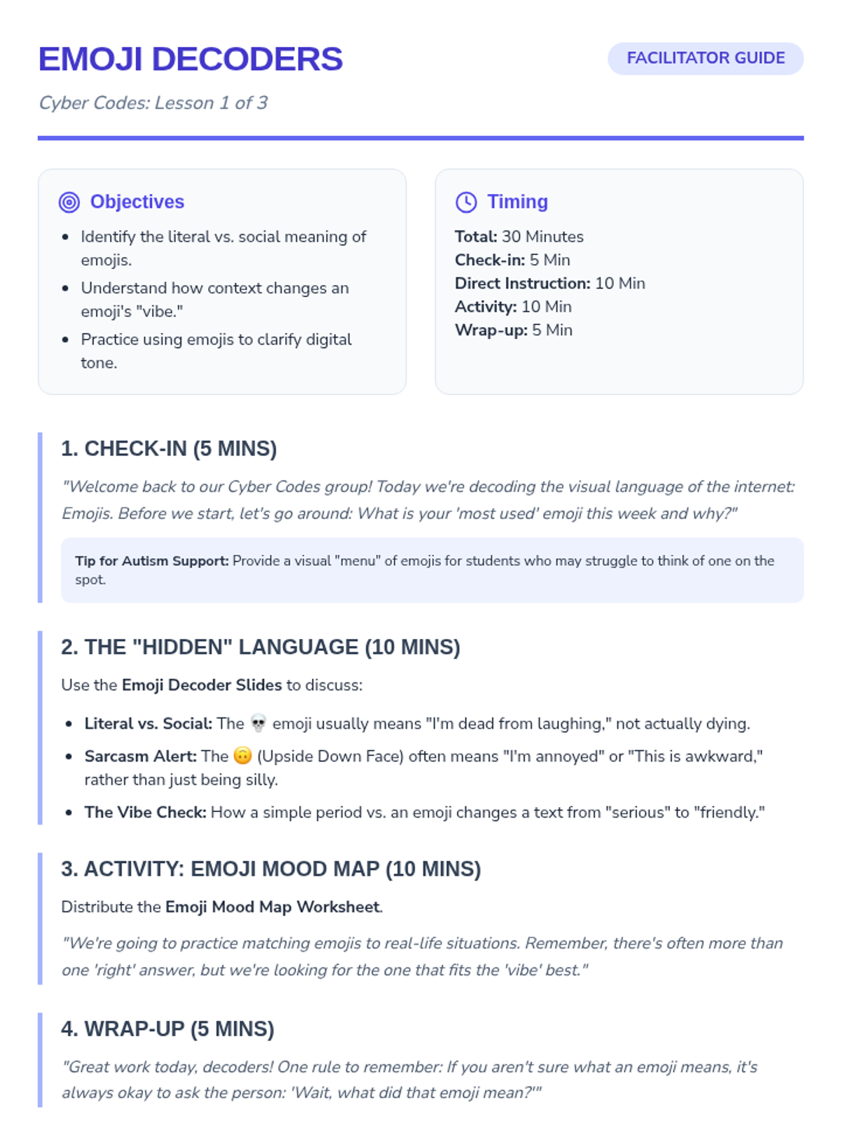 A three-part group counseling series designed for middle school students with autism, focusing on decoding digital communication through emojis, slang, and online safety protocols.