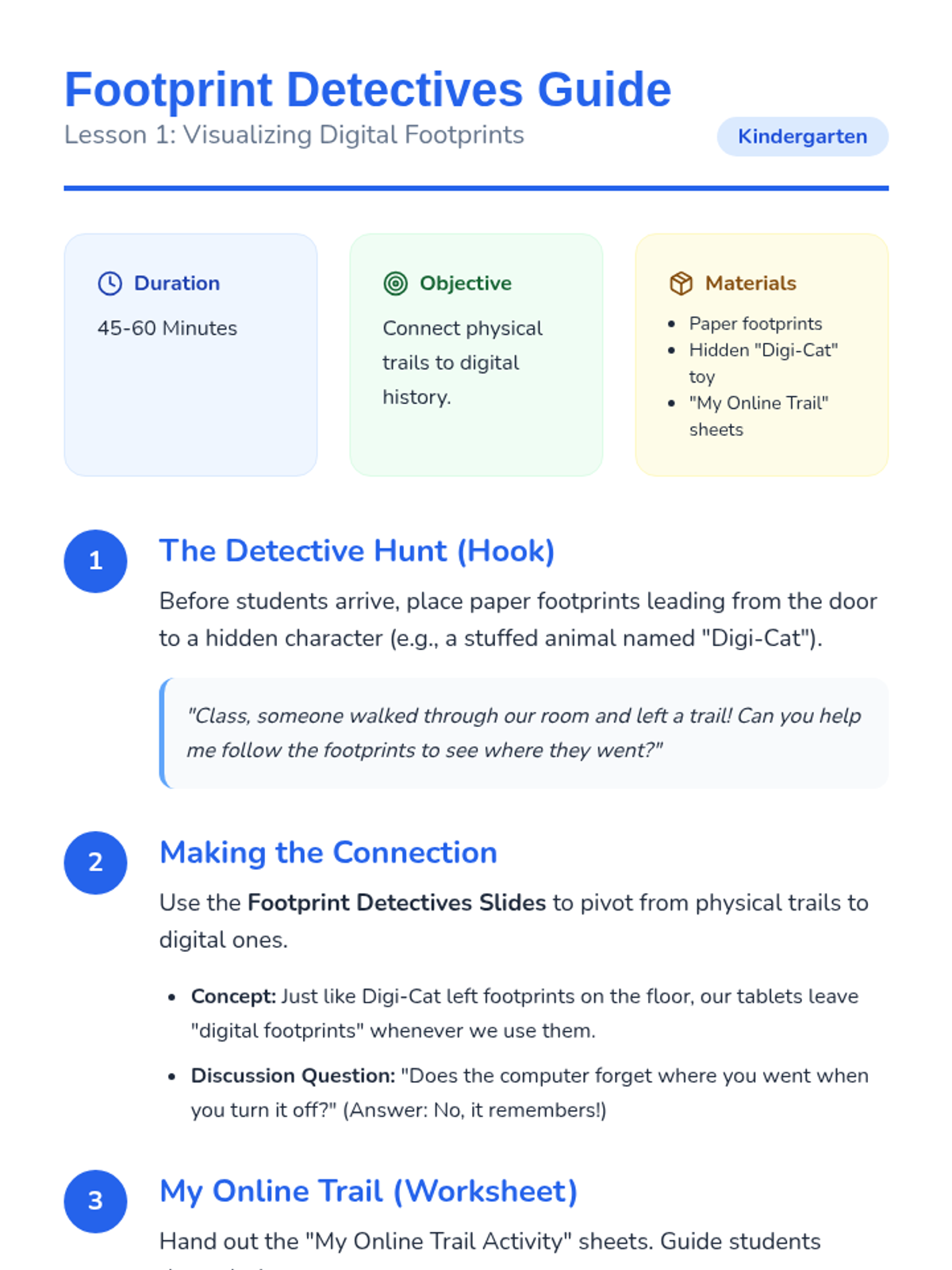 A Kindergarten sequence focused on making digital footprints concrete through physical analogies, promoting online kindness, and establishing safety protocols for young internet users.