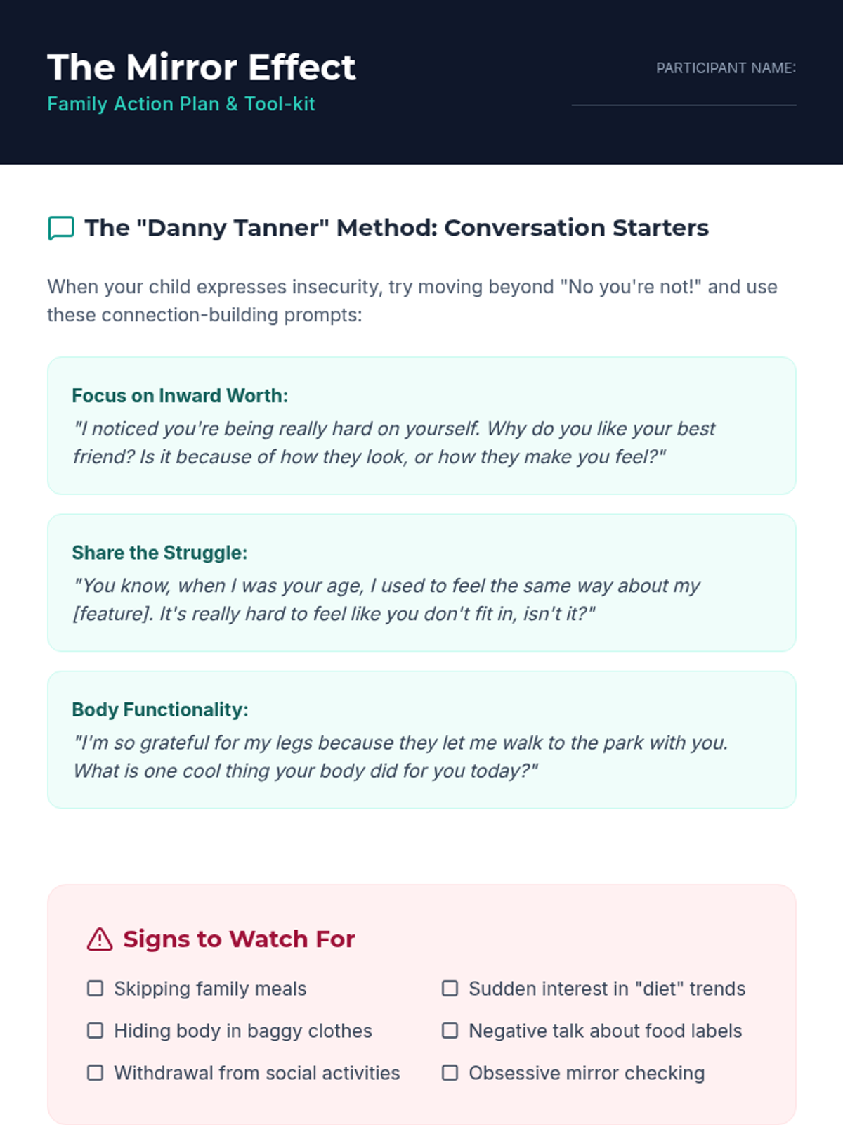A transformative workshop for parents focused on identifying early signs of body image issues in children and fostering a home environment of body neutrality and positive self-talk. Through the lens of a classic Full House scene, parents explore the impact of diet culture and learn to use vulnerability as a parenting tool.