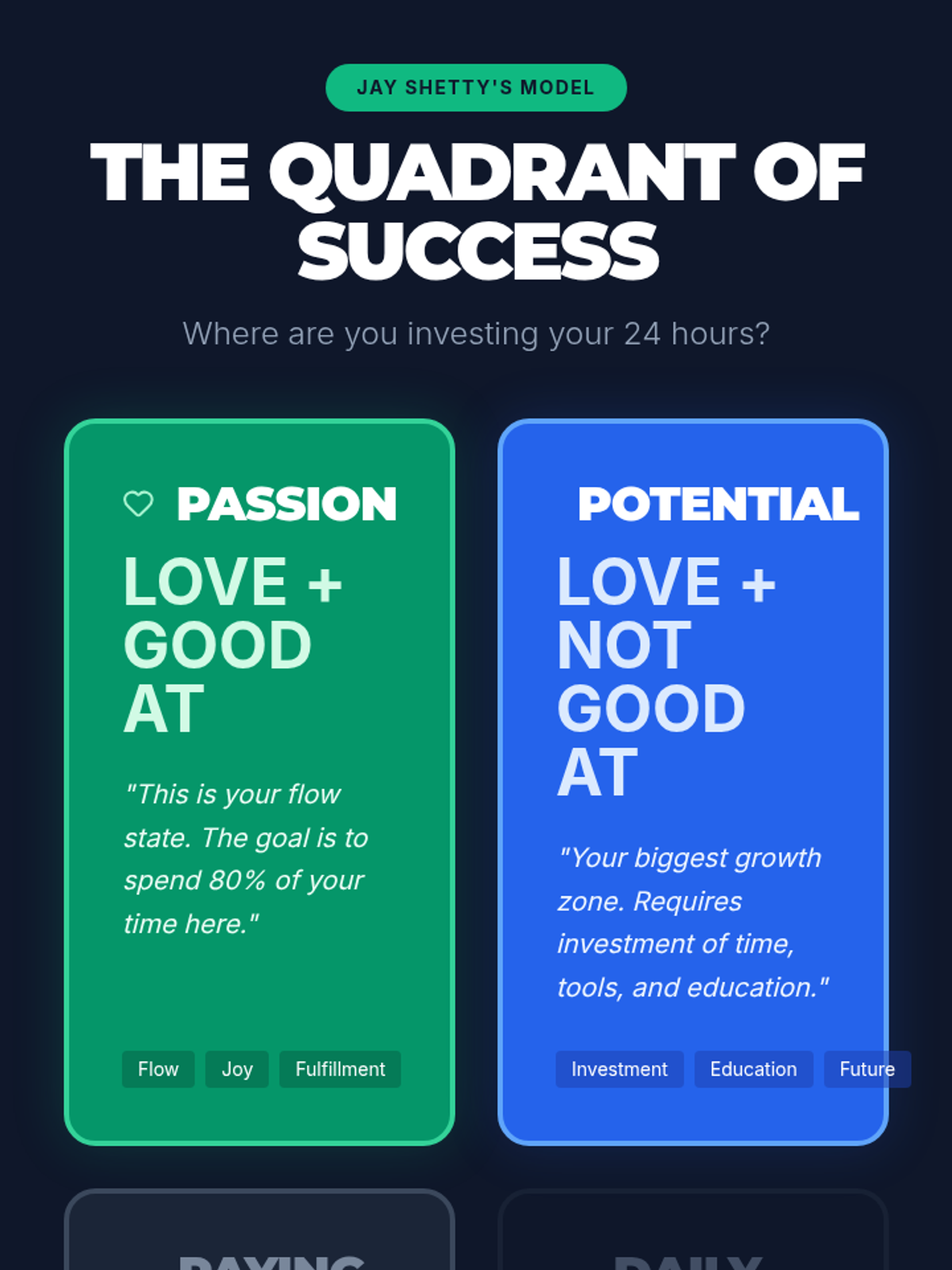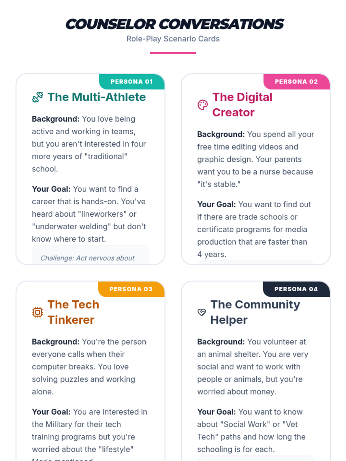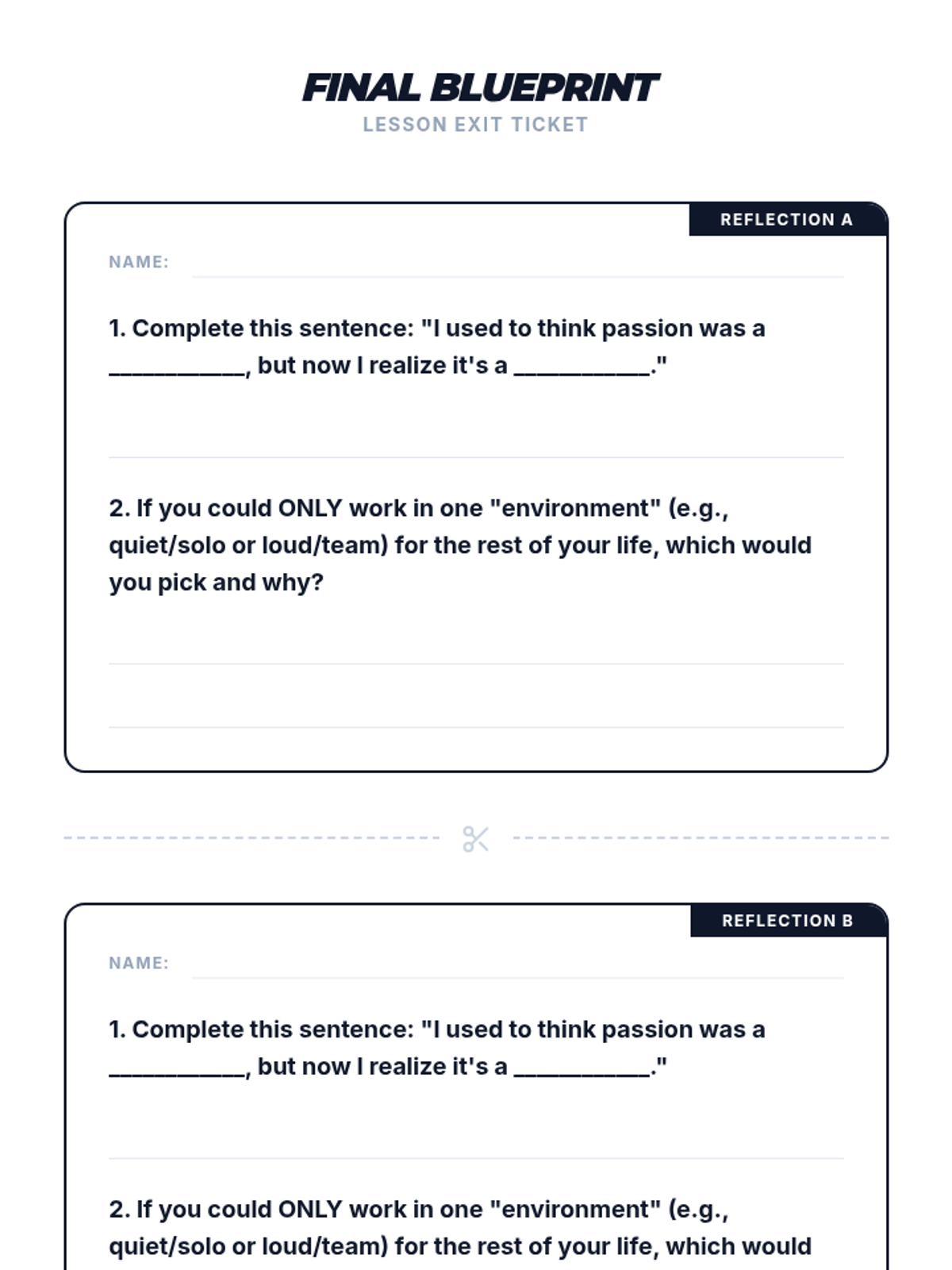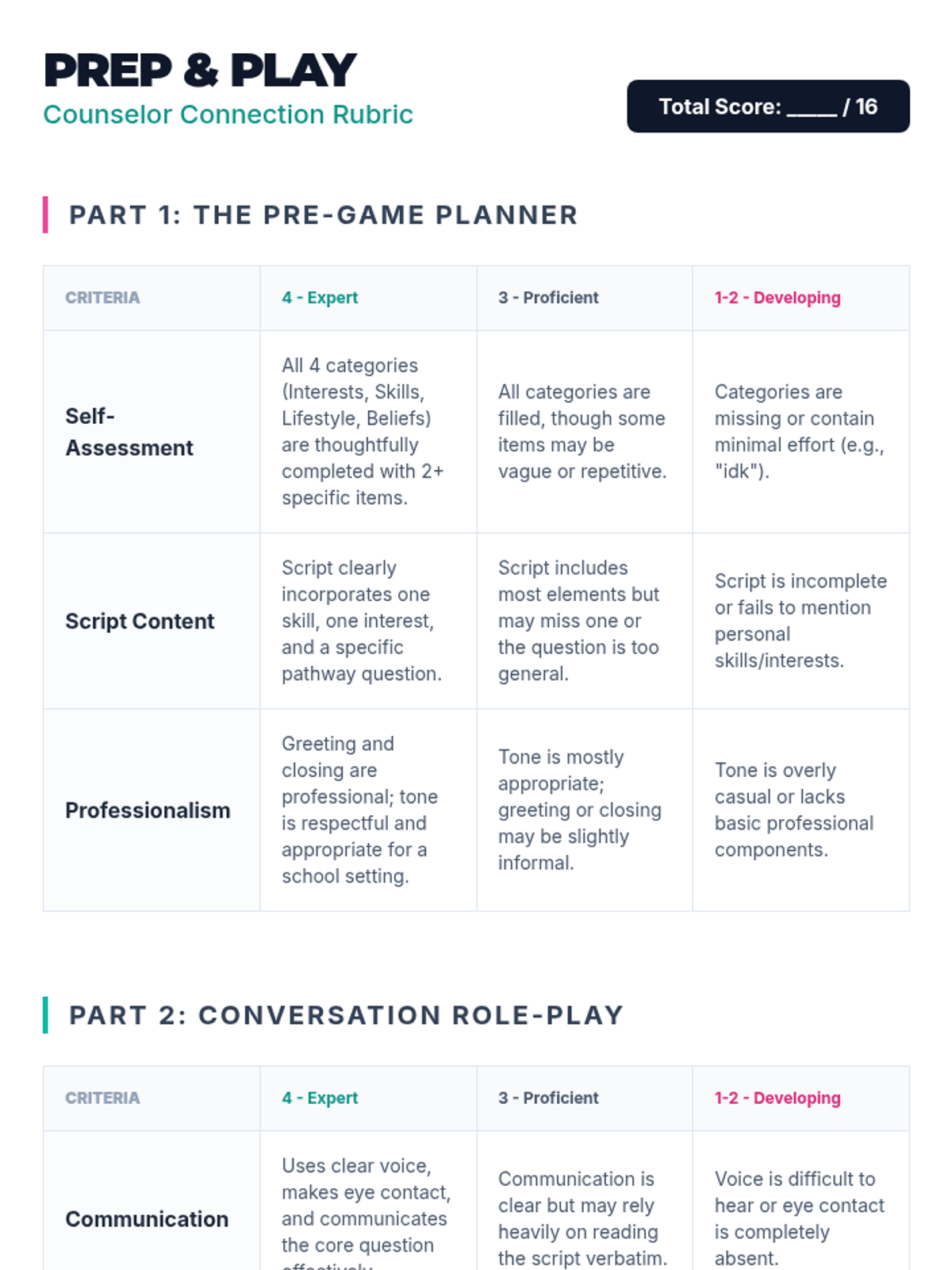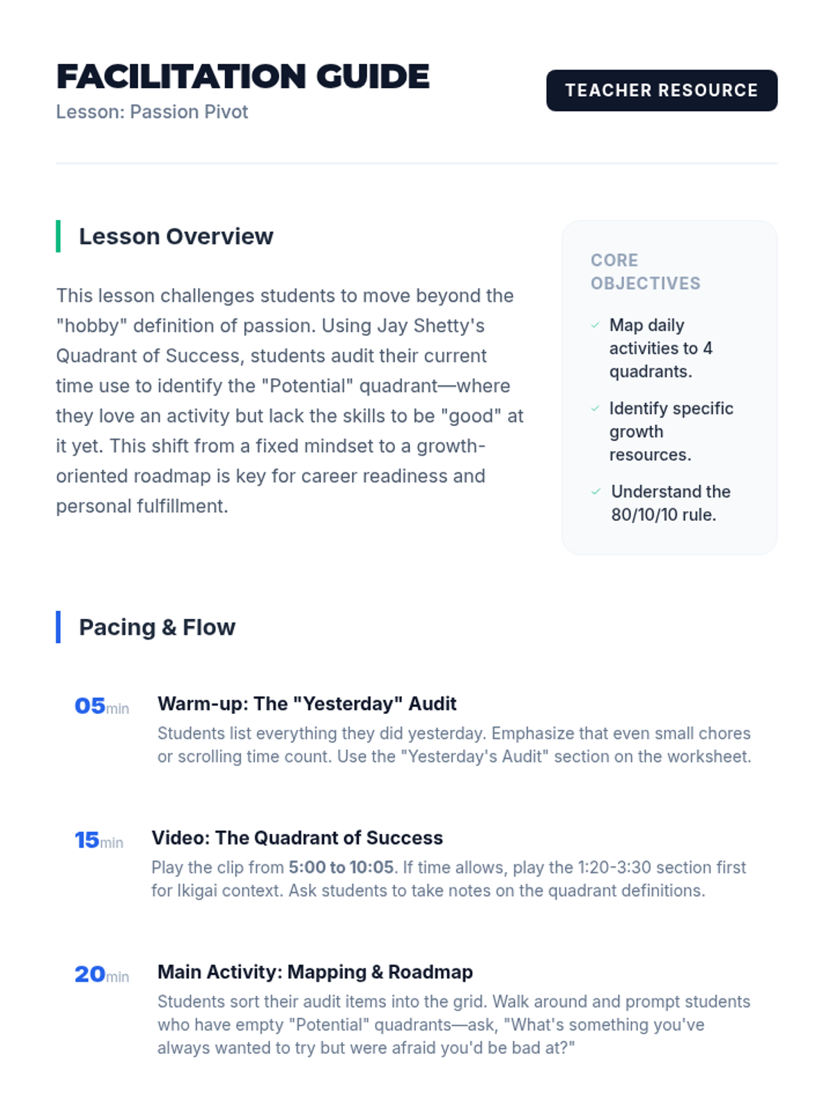 A career-readiness sequence designed for older students and undergraduates to identify their current skills, potential growth areas, and personality types using the Ikigai and Quadrant of Success models. Students move from auditing their time to creating a strategic roadmap for professional development.