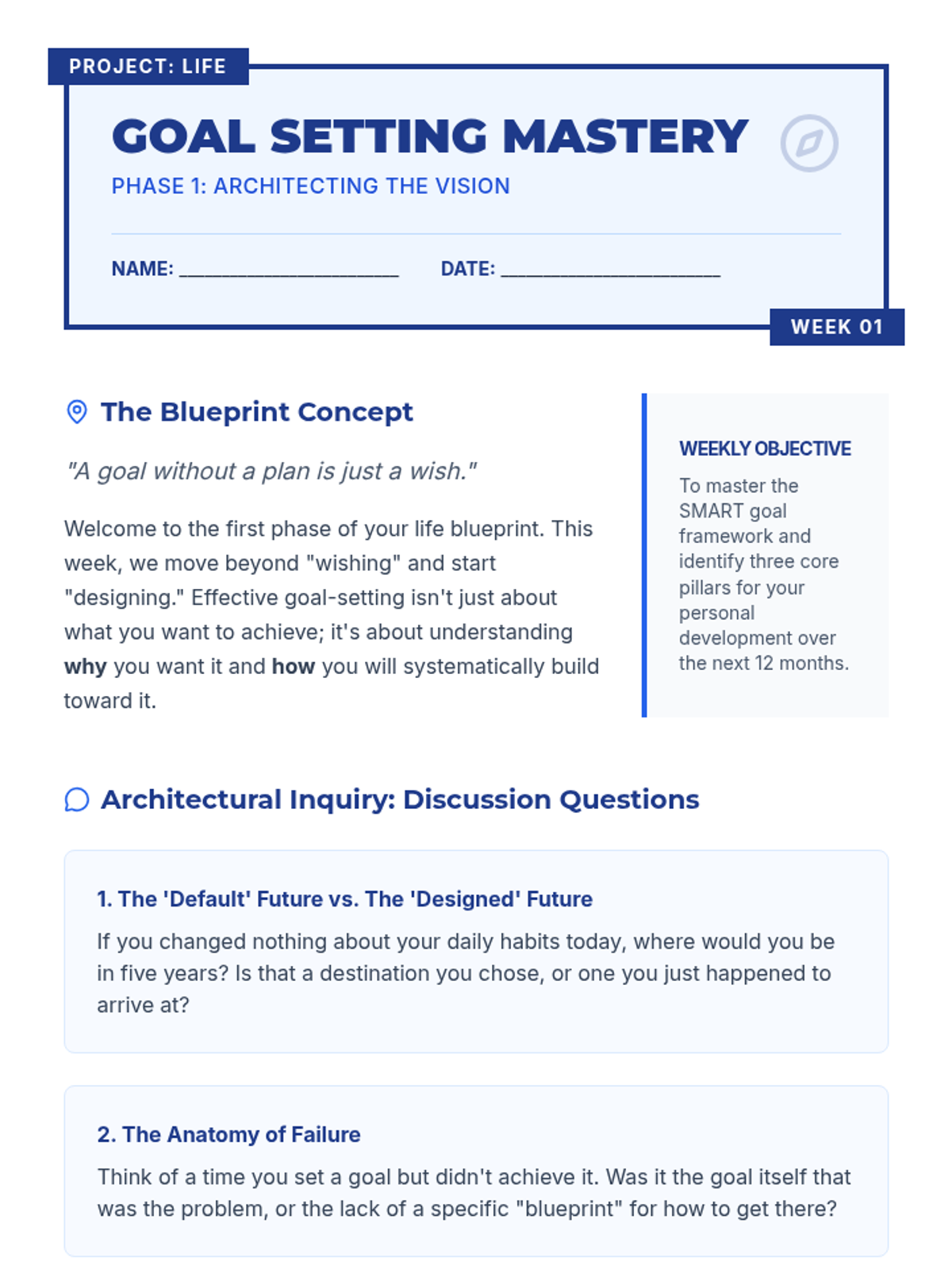 A comprehensive 9-week curriculum designed to equip young adults with essential skills for personal well-being, effective communication, and healthy relationships. This course uses a 'blueprint' theme to help students architect their own futures through goal-setting, stress management, and interpersonal growth.