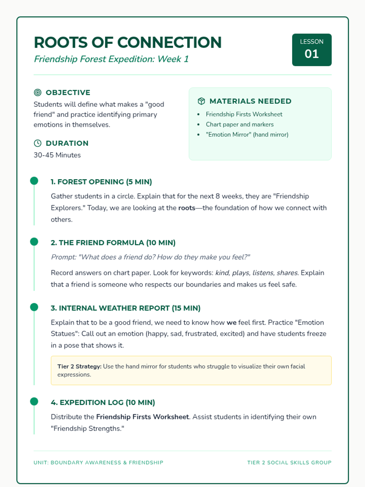 An 8-week social-emotional learning curriculum for 3rd-grade Tier 2 groups, focused on building healthy boundaries and positive friendship skills using a nature-themed 'Field Guide' aesthetic.