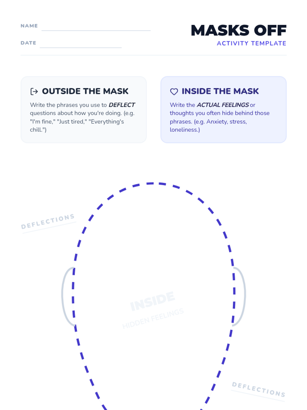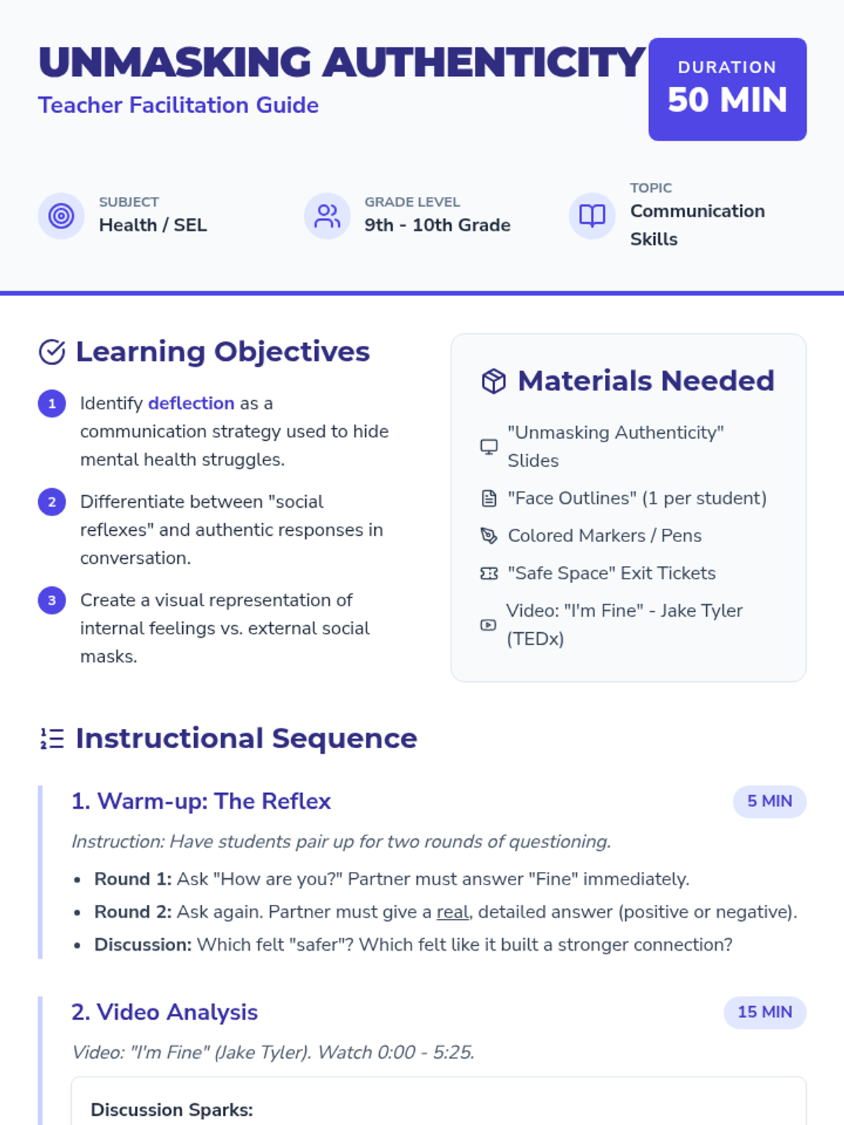 A mental health and communication lesson for high schoolers focusing on 'deflection' as a social reflex. Students analyze Jake Tyler's 'I'm Fine' TEDx talk, explore the 'masks' they wear in social interactions, and practice authentic listening skills.