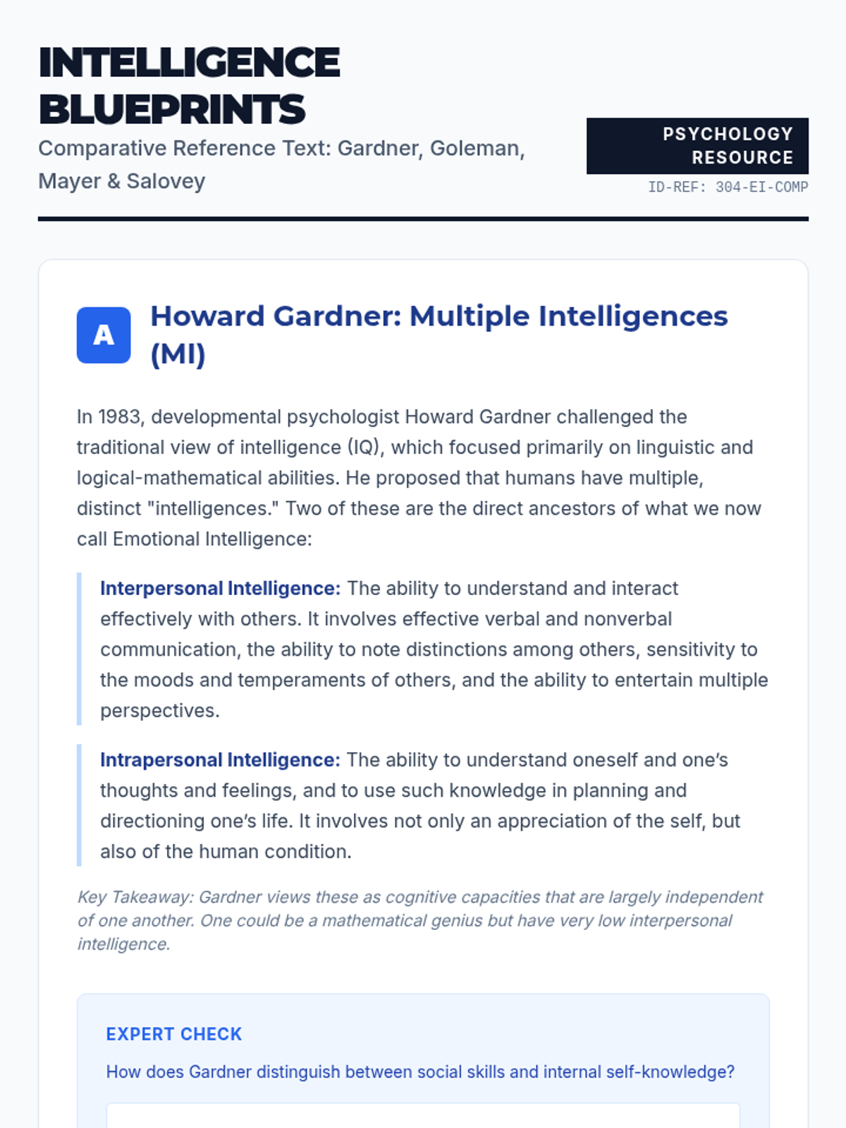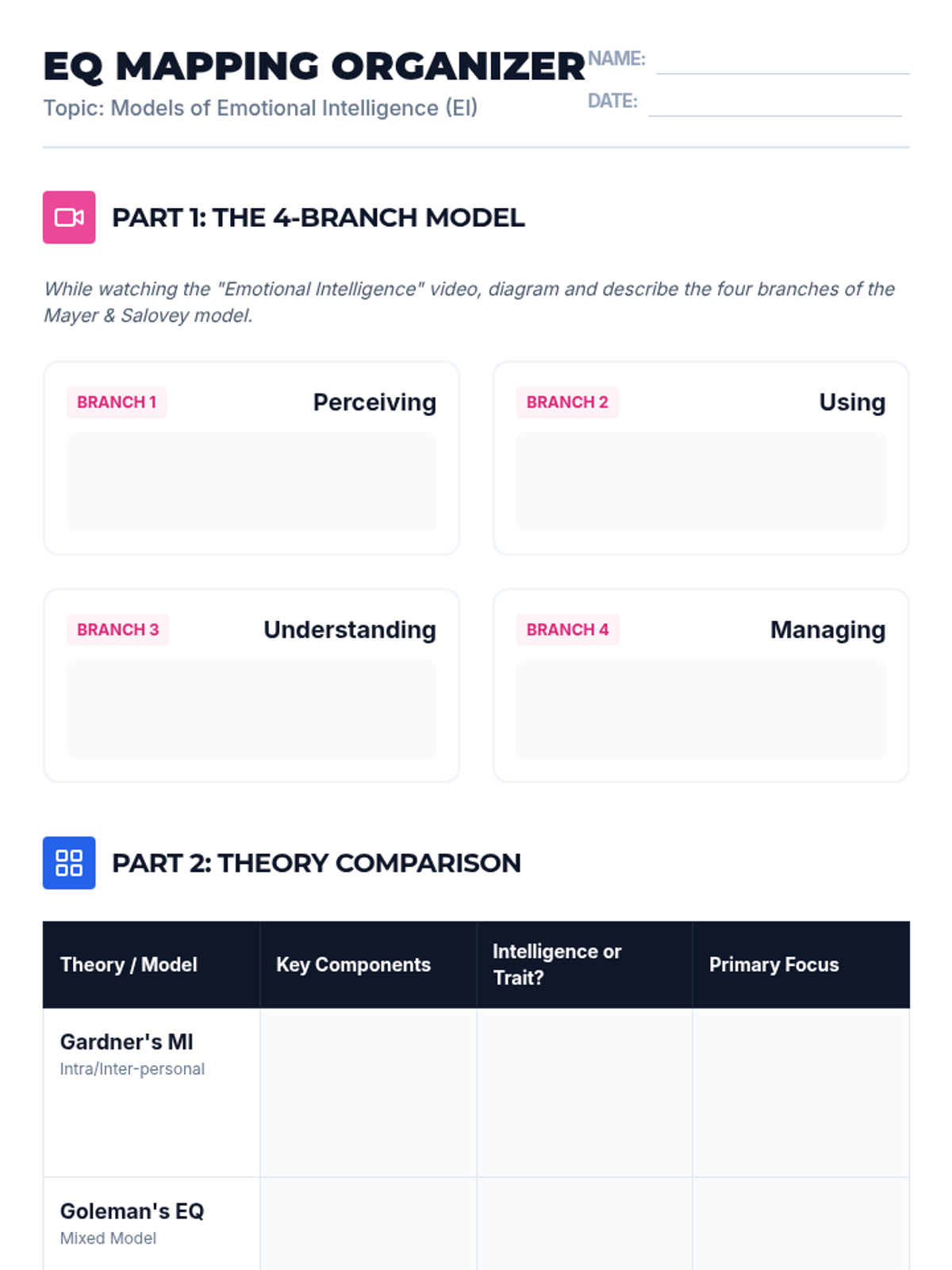 This lesson explores the concept of Emotional Intelligence (EI) through the lens of the Mayer and Salovey model, comparing it with other prominent theories of intelligence such as Gardner's Multiple Intelligences and Goleman's EI model. Students will evaluate whether EI is a distinct form of intelligence or a collection of personality traits.